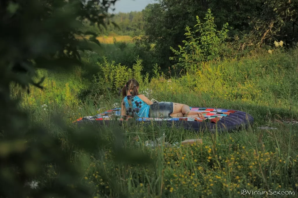 18-летняя девственница прикалывается над членом перед двойным проникновением на одеяле на открытом воздухе