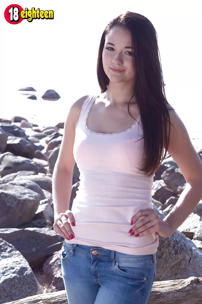 18-летняя красотка Оливия обнажает бритую киску подростка на открытом воздухе на пляже
