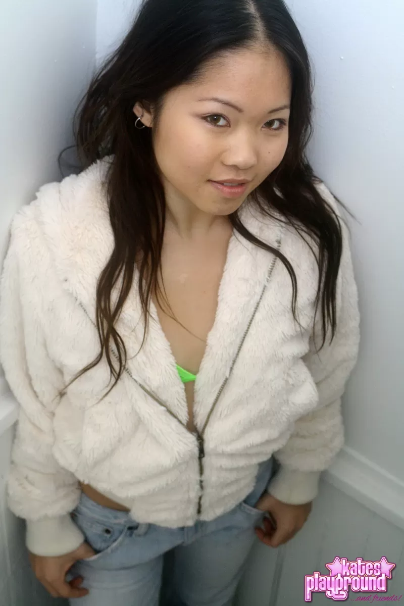 Азиатка-первокурсница Грейс снимает свое пальто с капюшоном, чтобы позировать в бикини