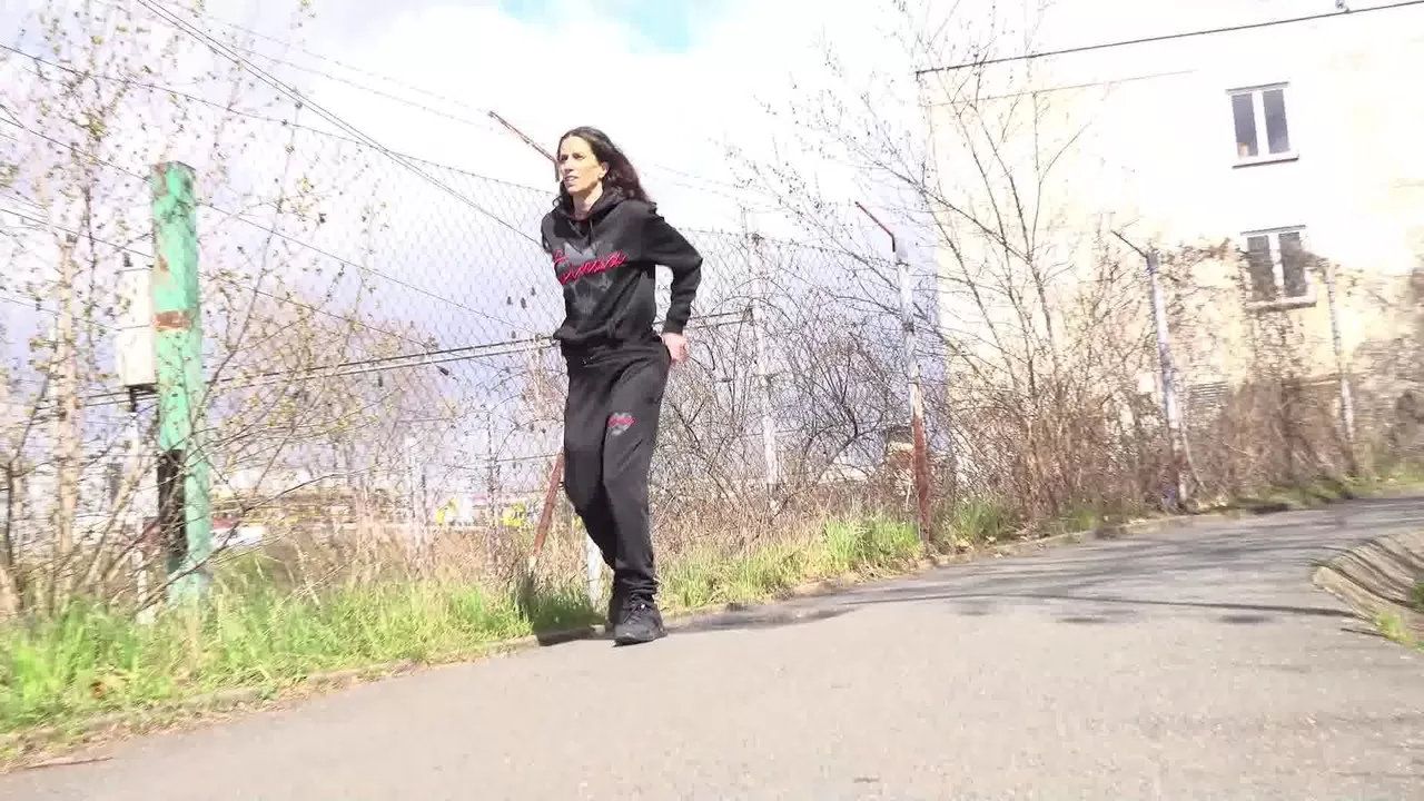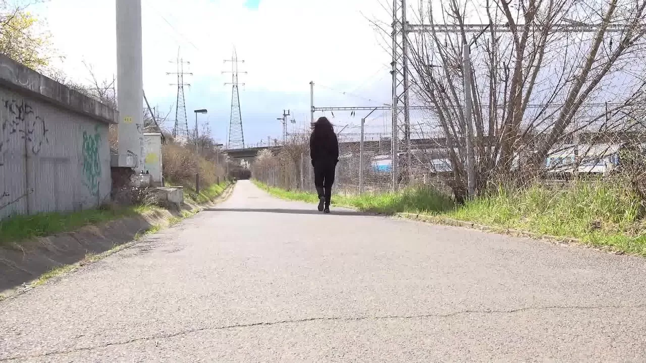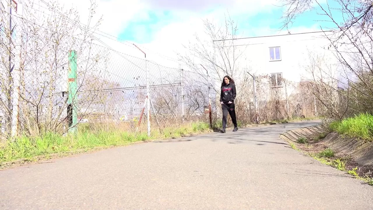 Белая девушка Али Бордо днем срочно отходит в туалет на асфальтированной дороге