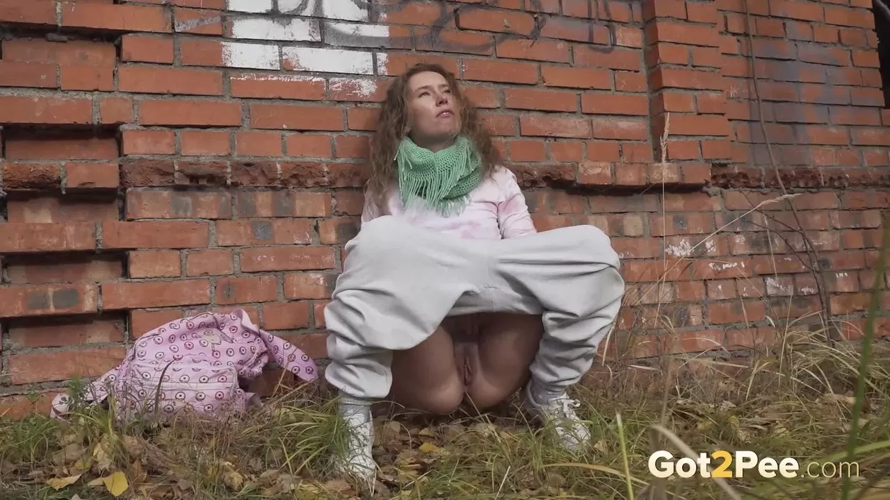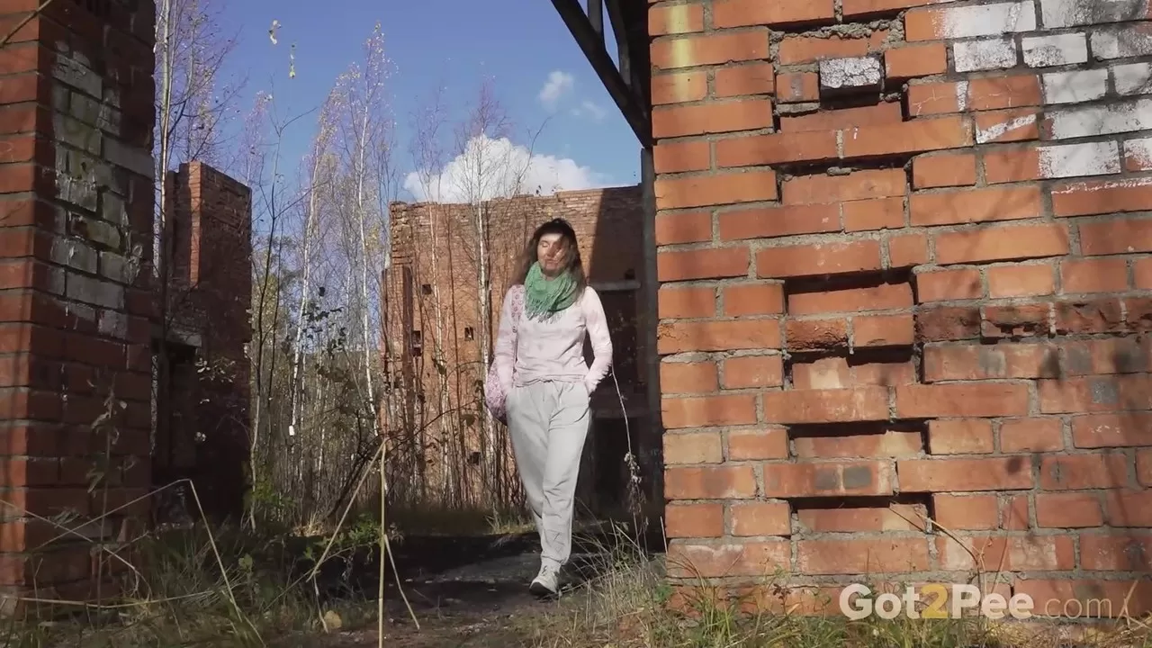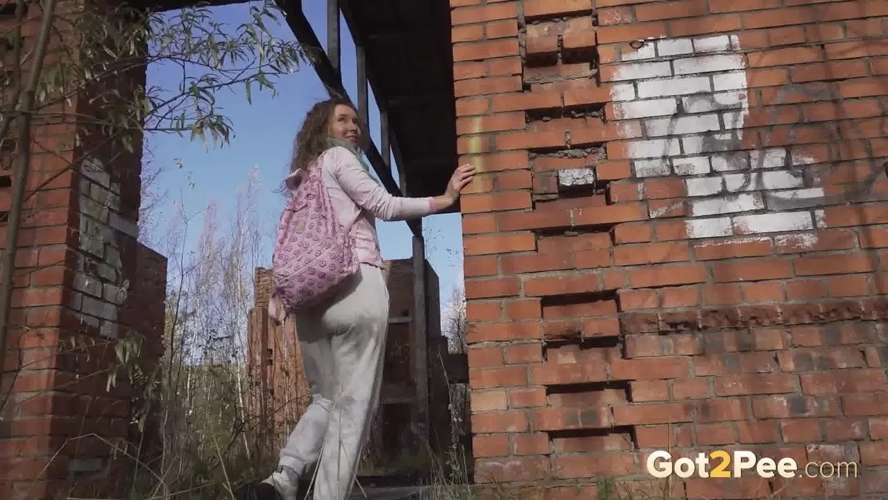 Белая девушка Рита отходит в туалет за заброшенным кирпичным зданием