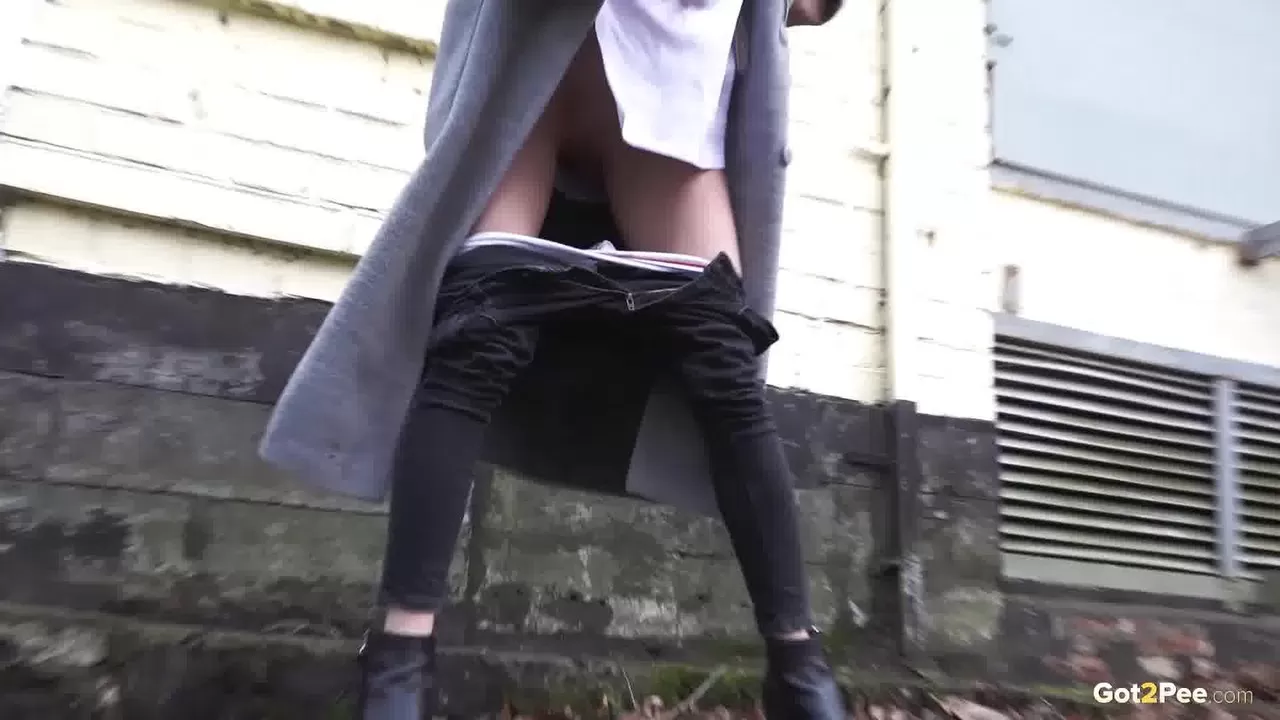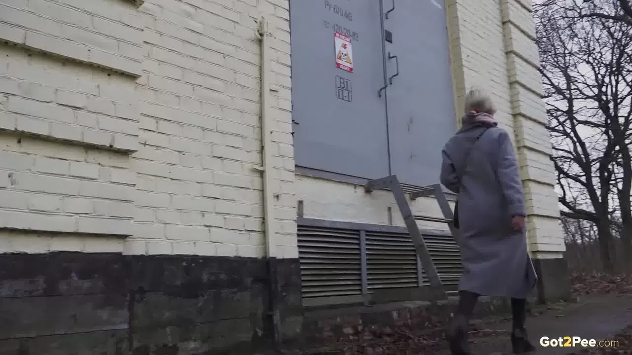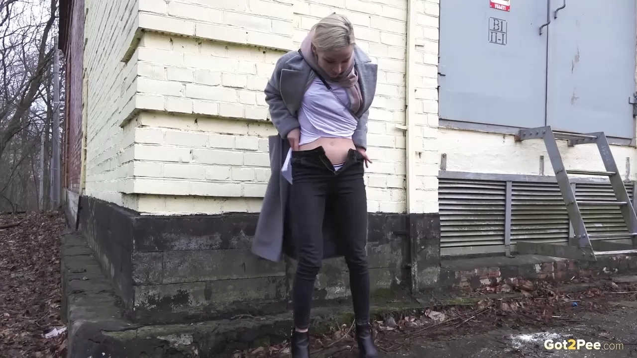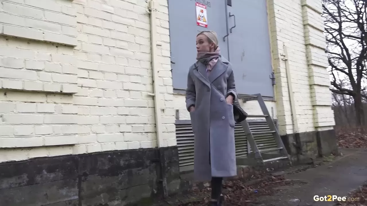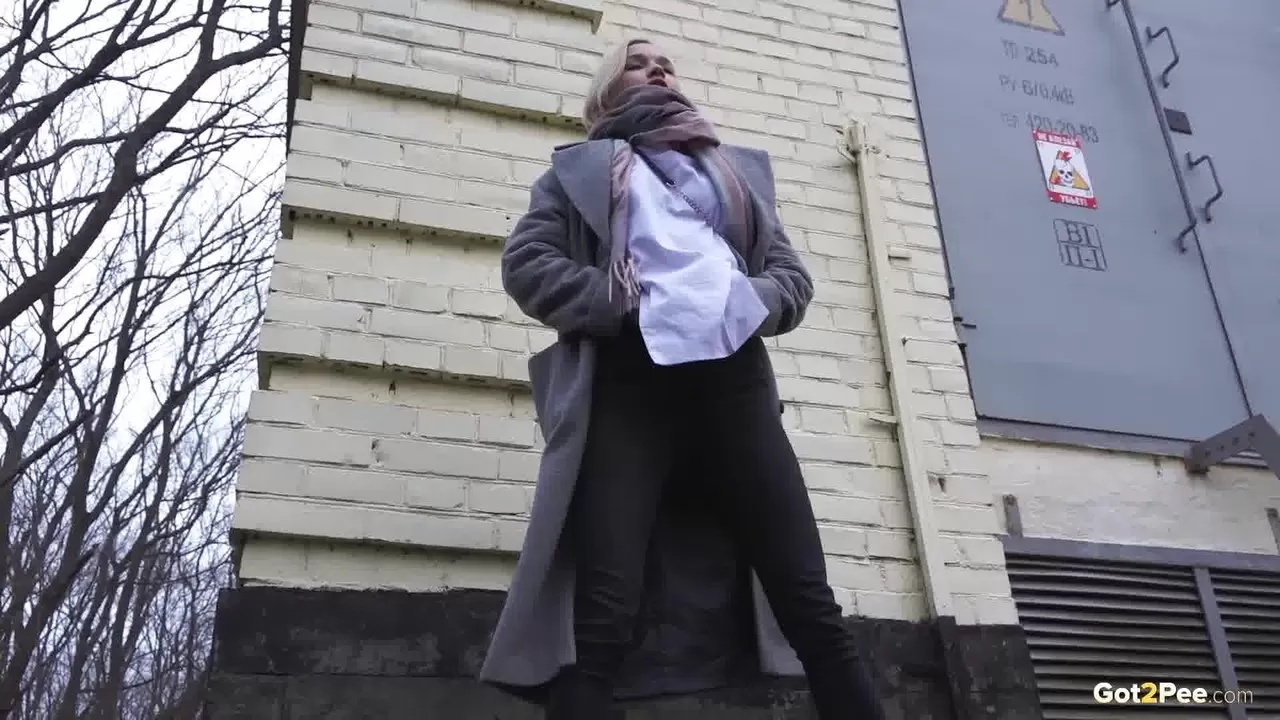 Белокурая девушка Маша стягивает штаны, чтобы пописать на тротуаре в дождливый день