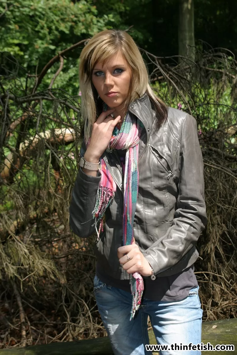 Блондинка с анорексией хватается за свою голую задницу после раздевания в лесу