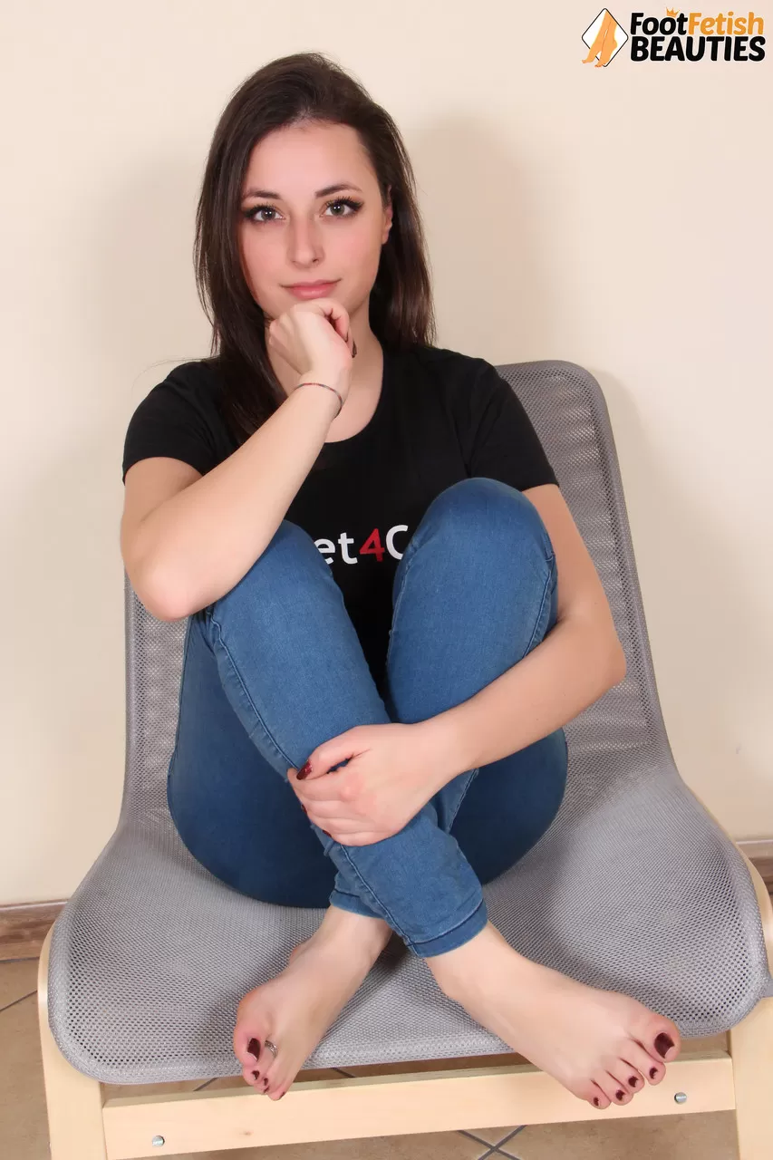 Брюнетка-одиночка Илария показывает свои босые ноги, моделируя не обнаженную натуру в джинсах