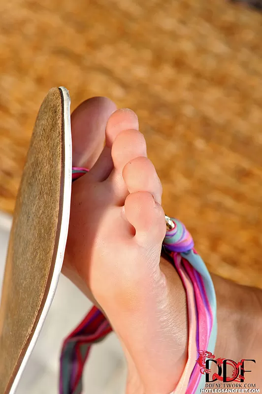 Длинноногая соло-девушка Элис Аланис сосет собственные пальцы после того, как сняла босоножки на улице
