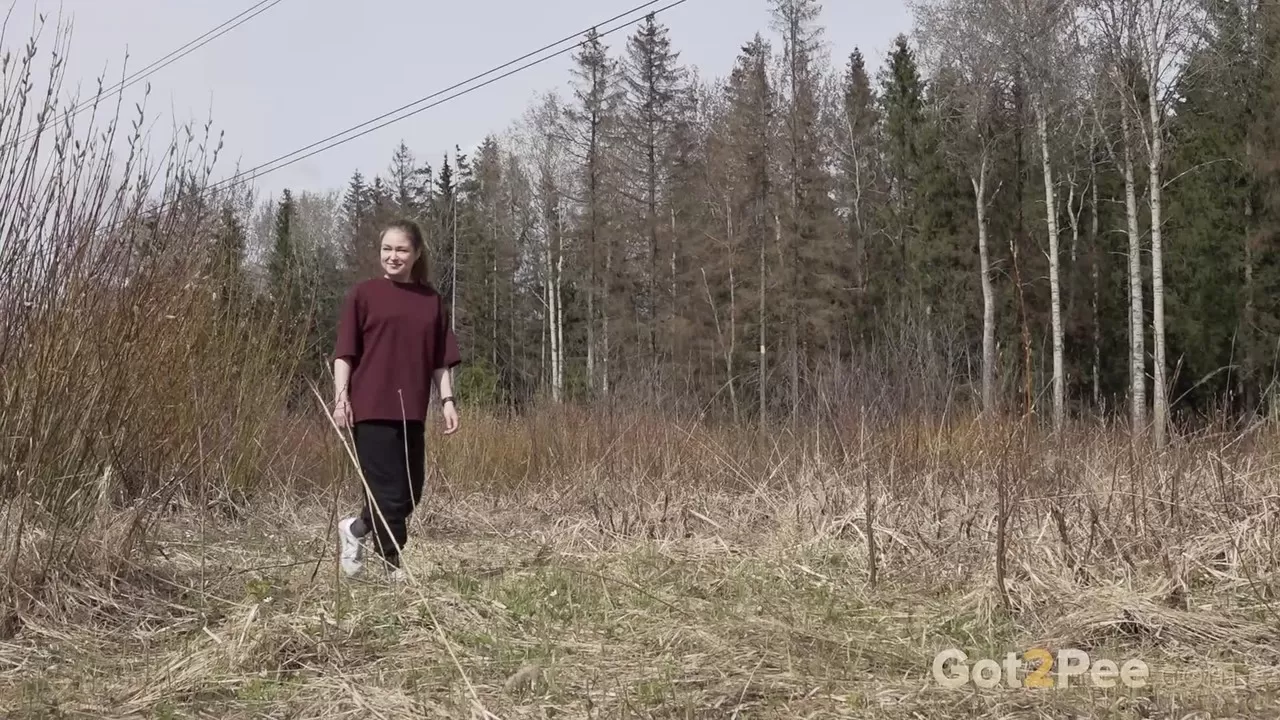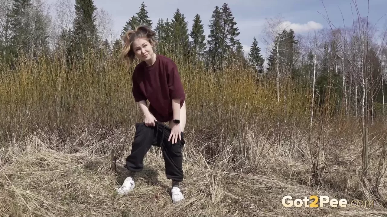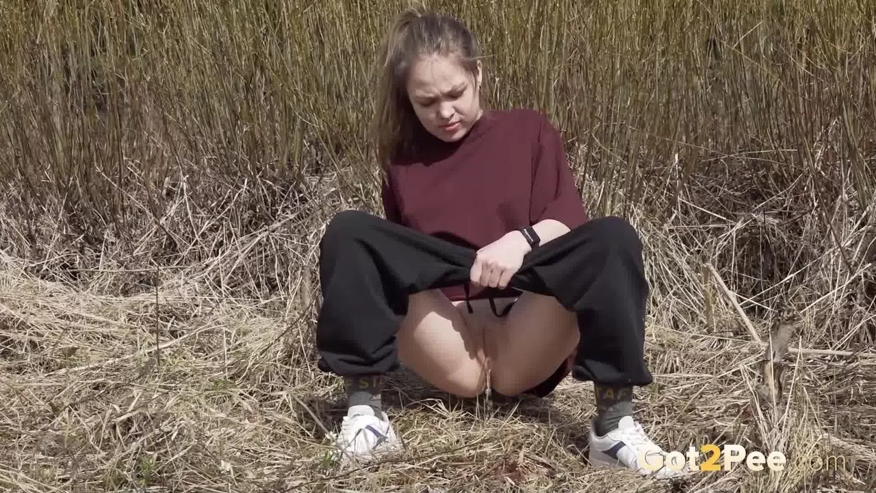 Европейская красотка садится на корточки на пустыре, чтобы пописать