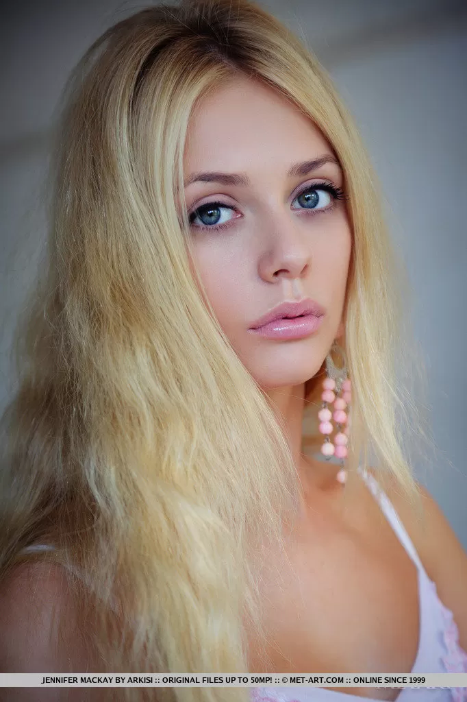 Горячая блондинка Дженнифер Маккей обнажает красивые сиськи в белых чулках
