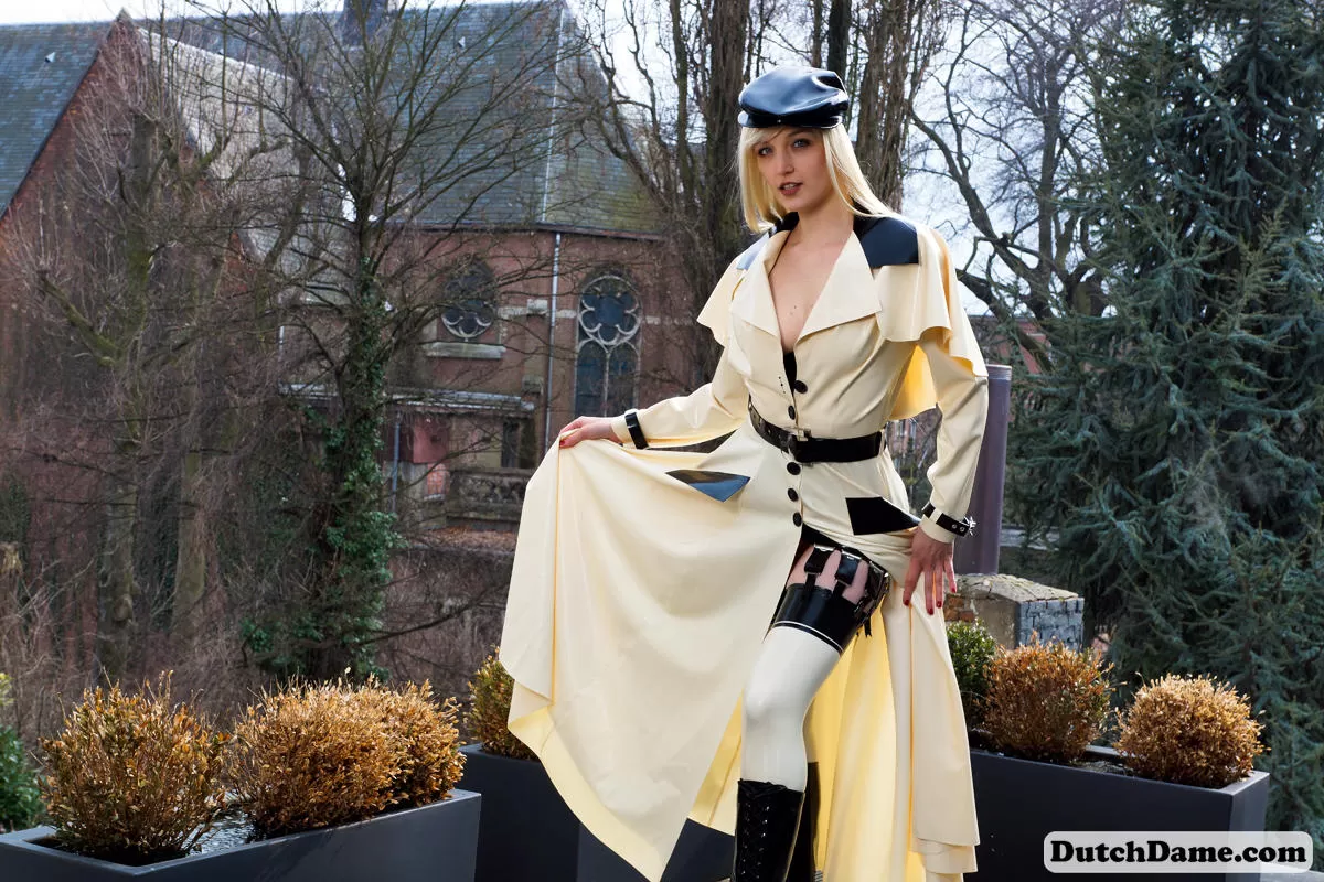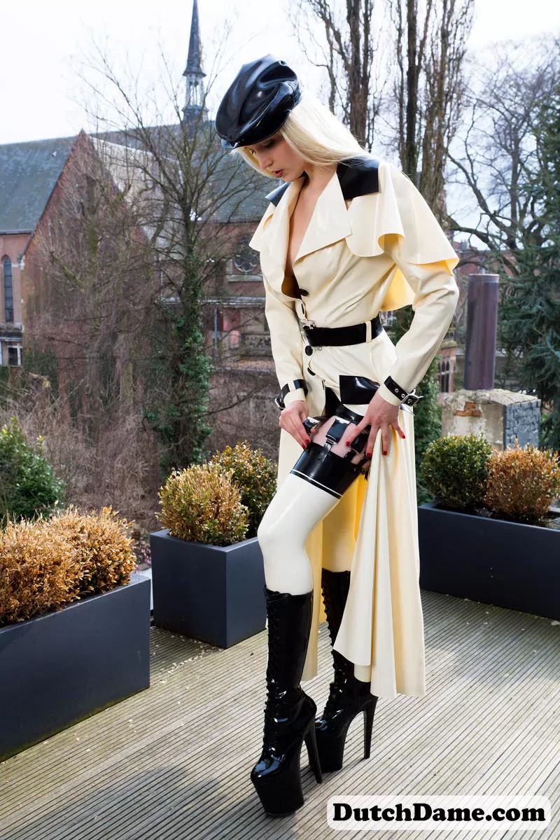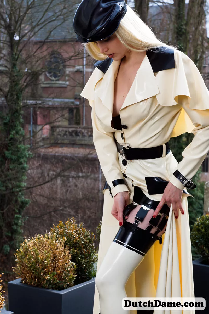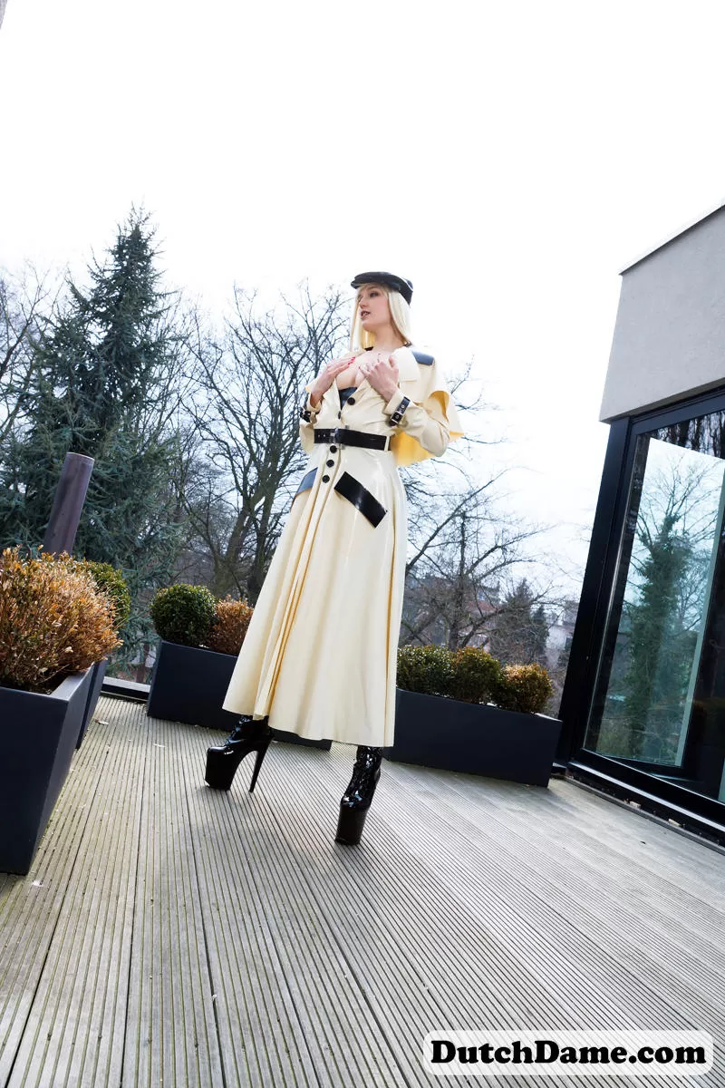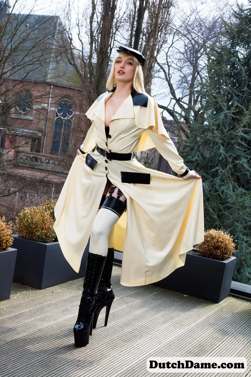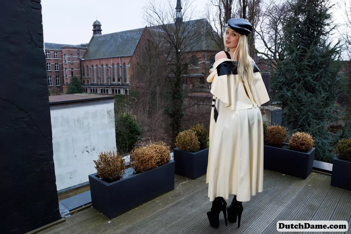 Горячая блондинка сверкает латексными подвязками, моделируя на открытом воздухе в резиновом наряде