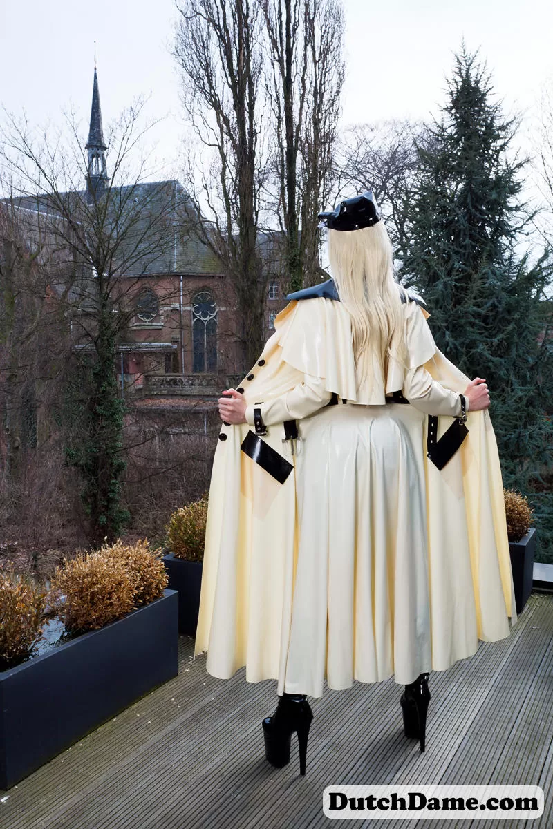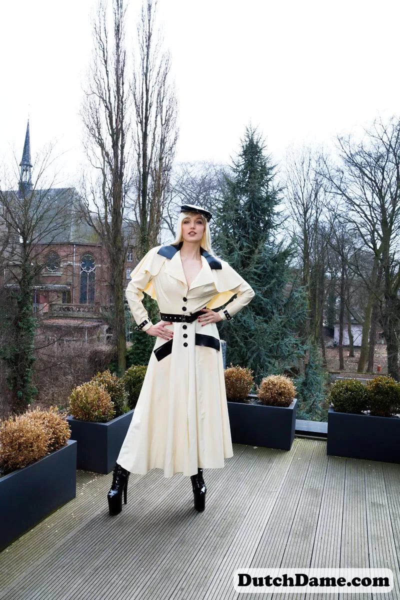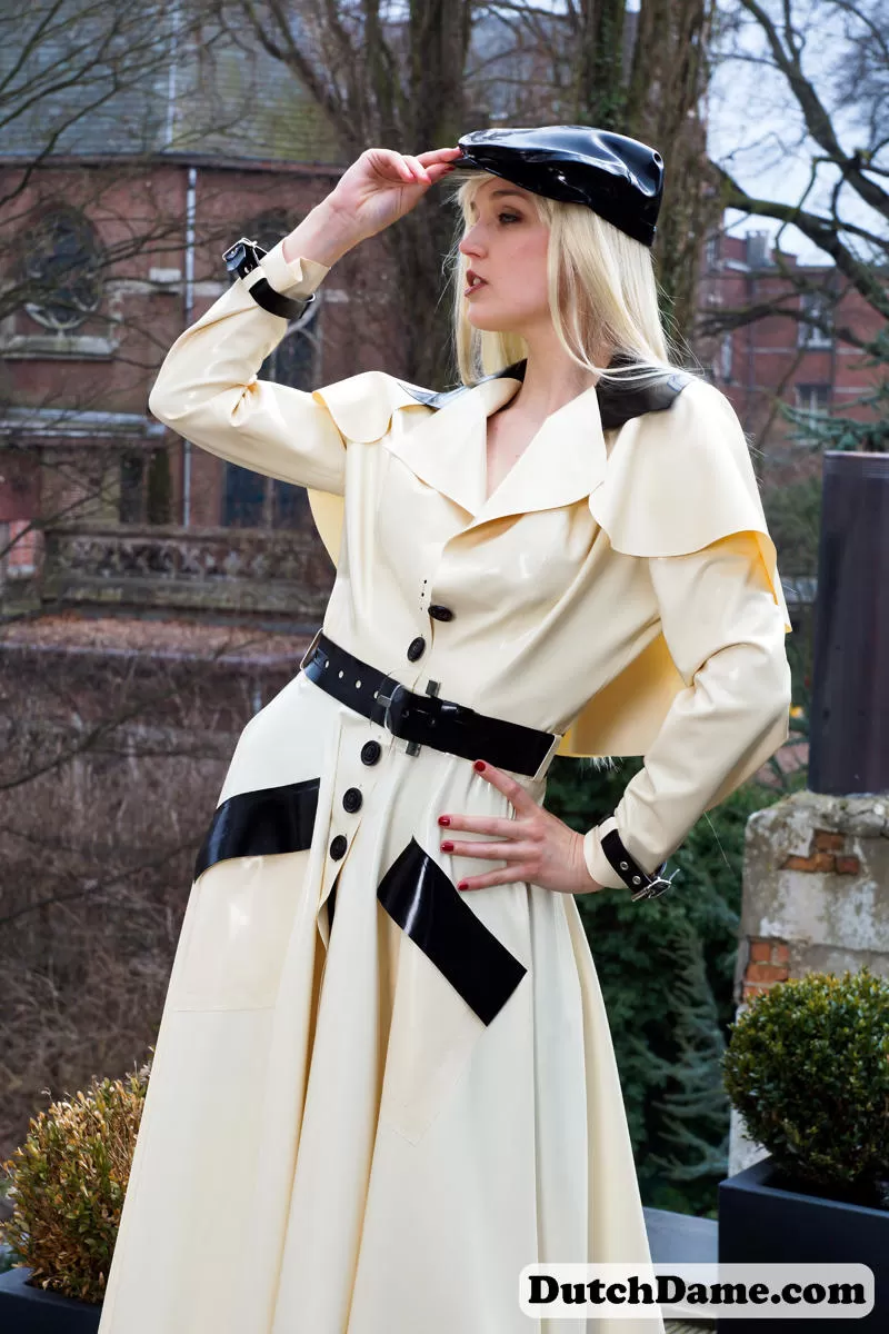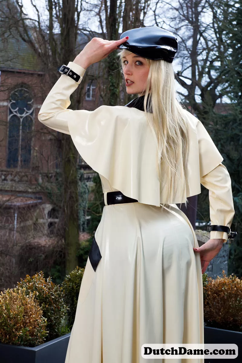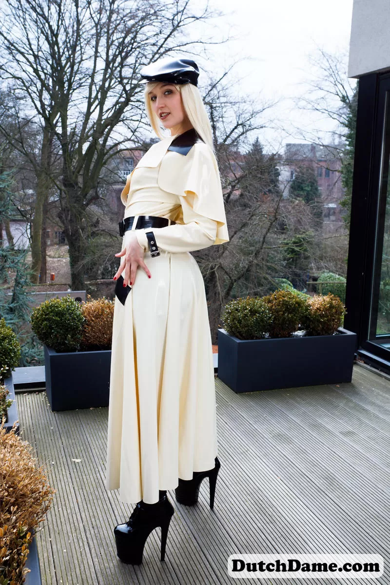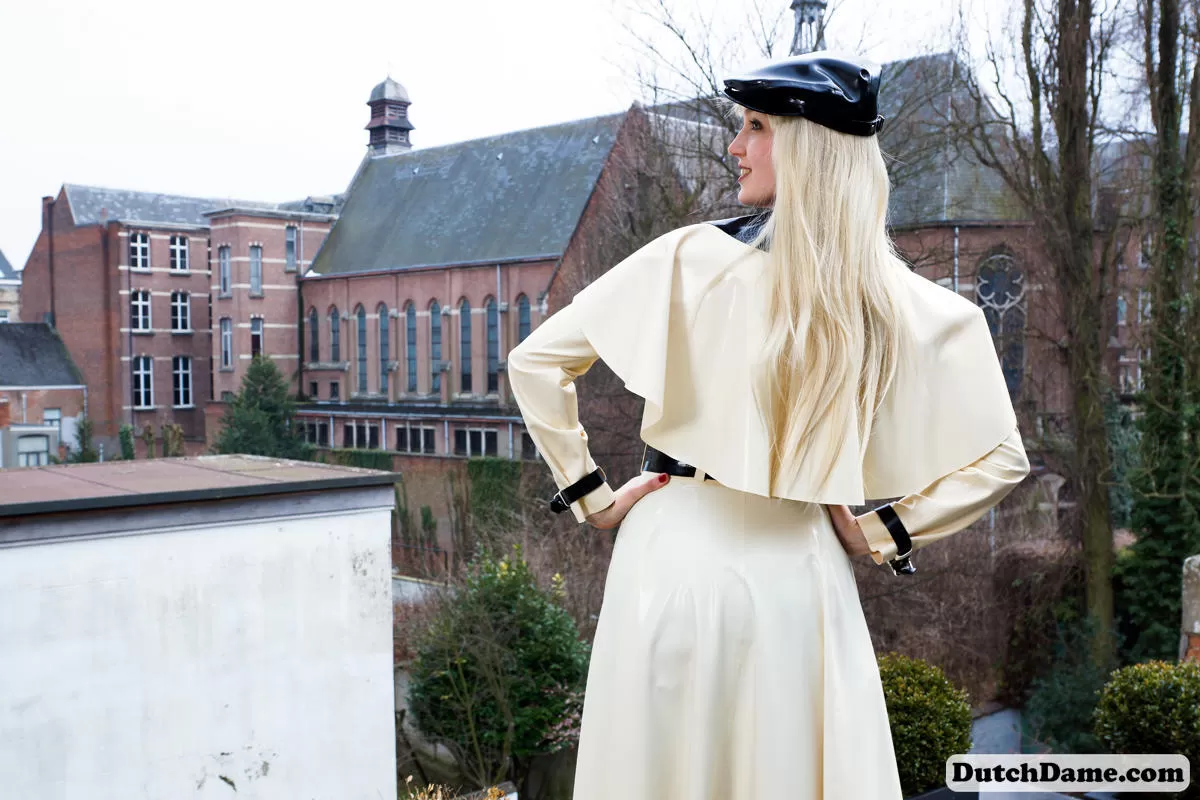Горячая блондинка сверкает латексными подвязками, моделируя на открытом воздухе в резиновом наряде