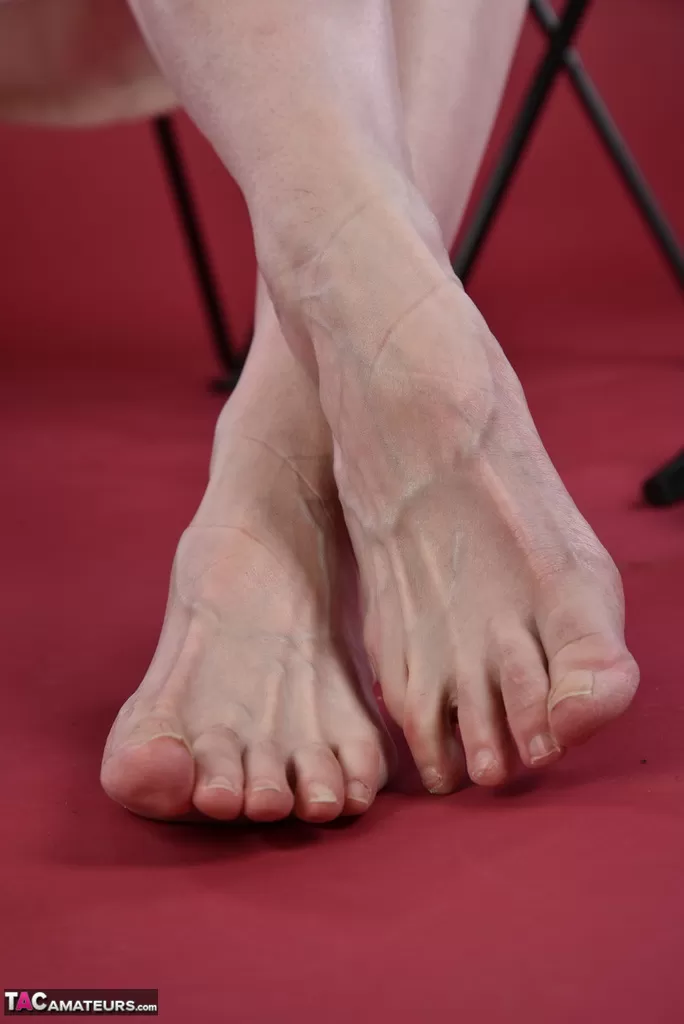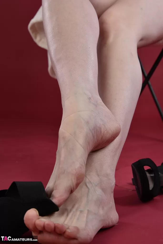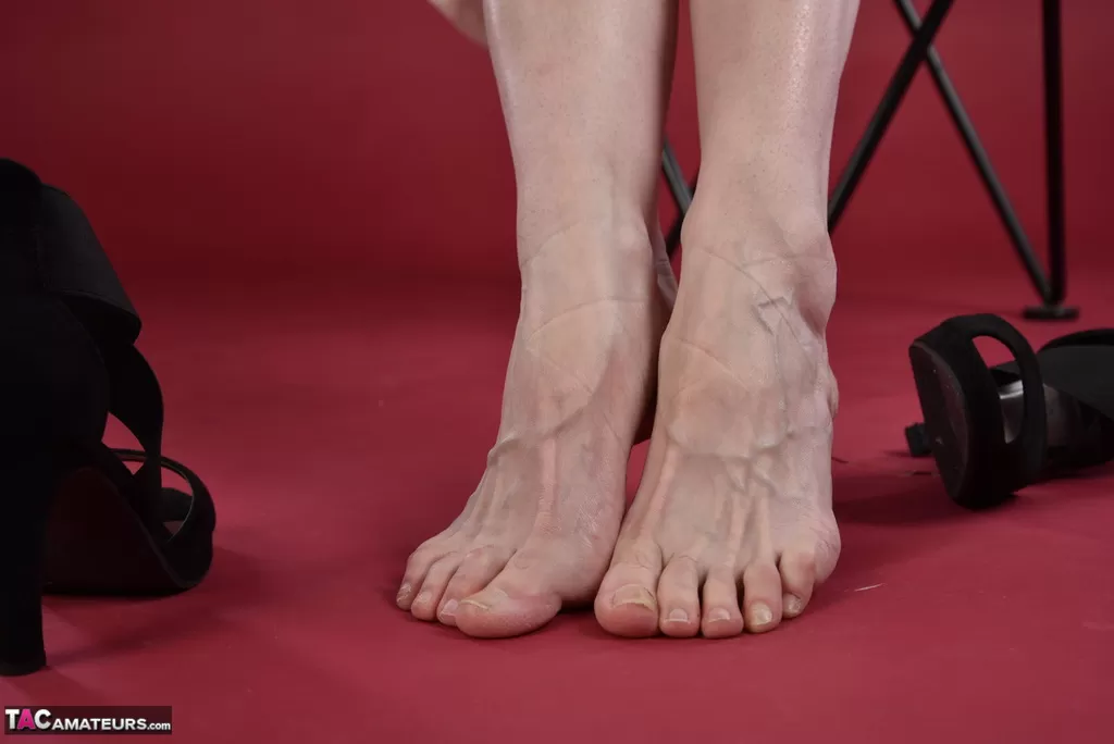 Горячая мамаша-любительская модель освобождает свои ноги от каблуков, прежде чем расстегнуть халат