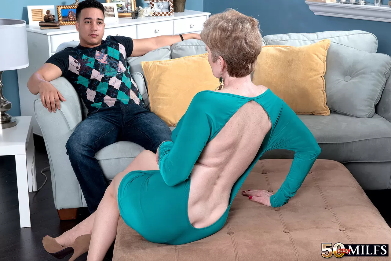 Горячая зрелая женщина с красивыми сиськами Синди Дикс соблазняет парня в платье с открытой спиной