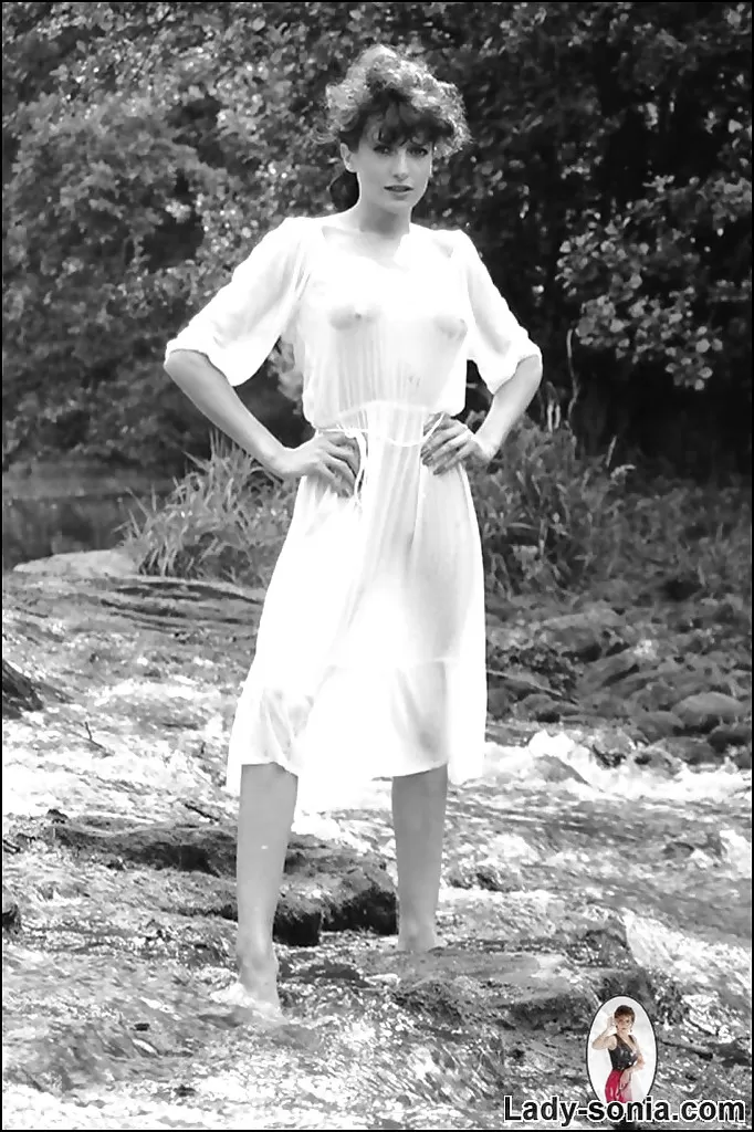 Грациозная брюнетка демонстрирует свои товары в этом винтажном фотосете