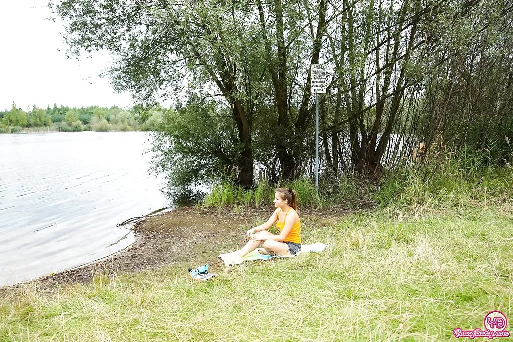 Грудастая молоденькая любительница Адель раздевается догола в лесу, чтобы искупаться в озере