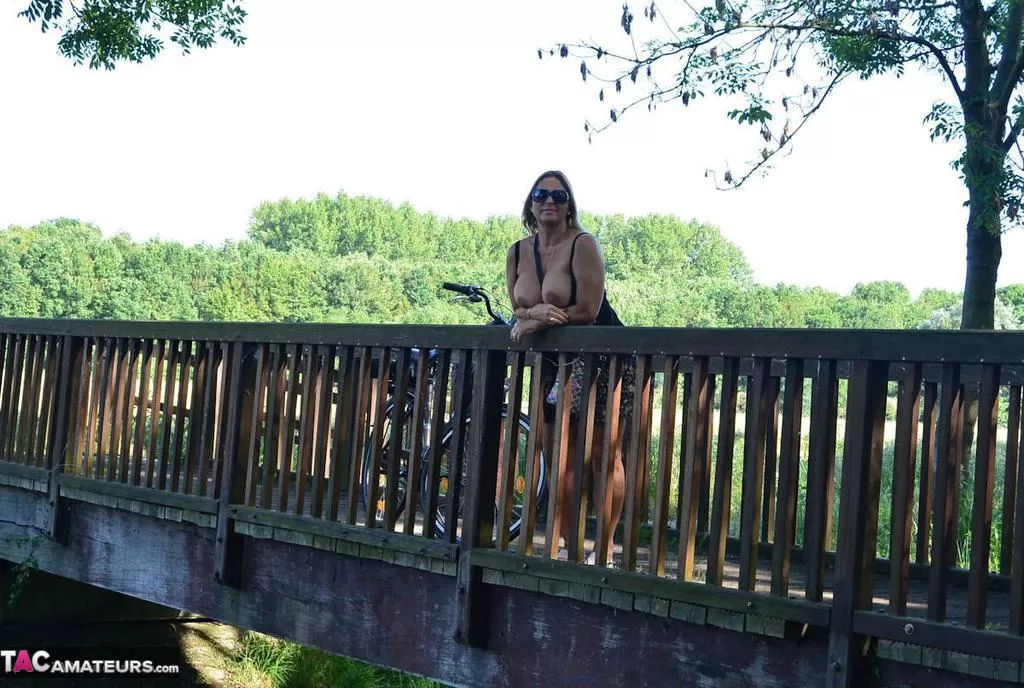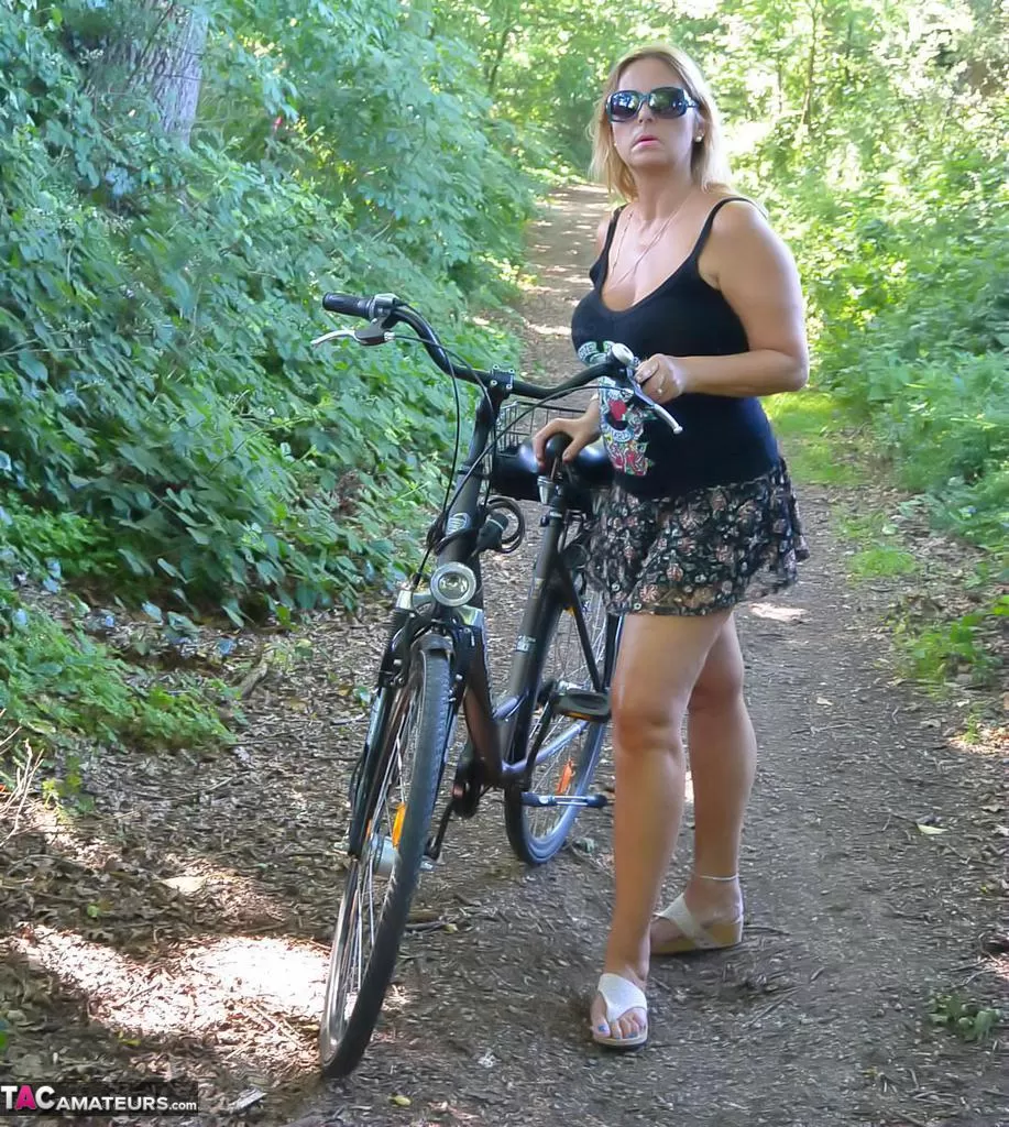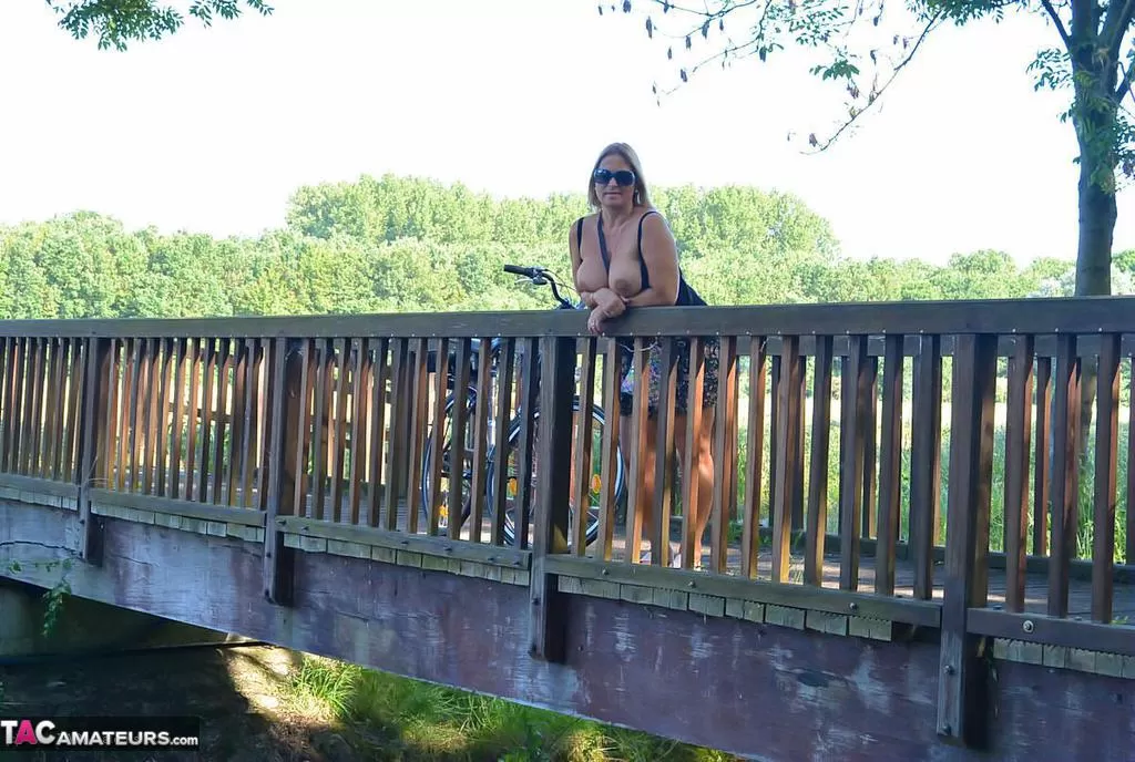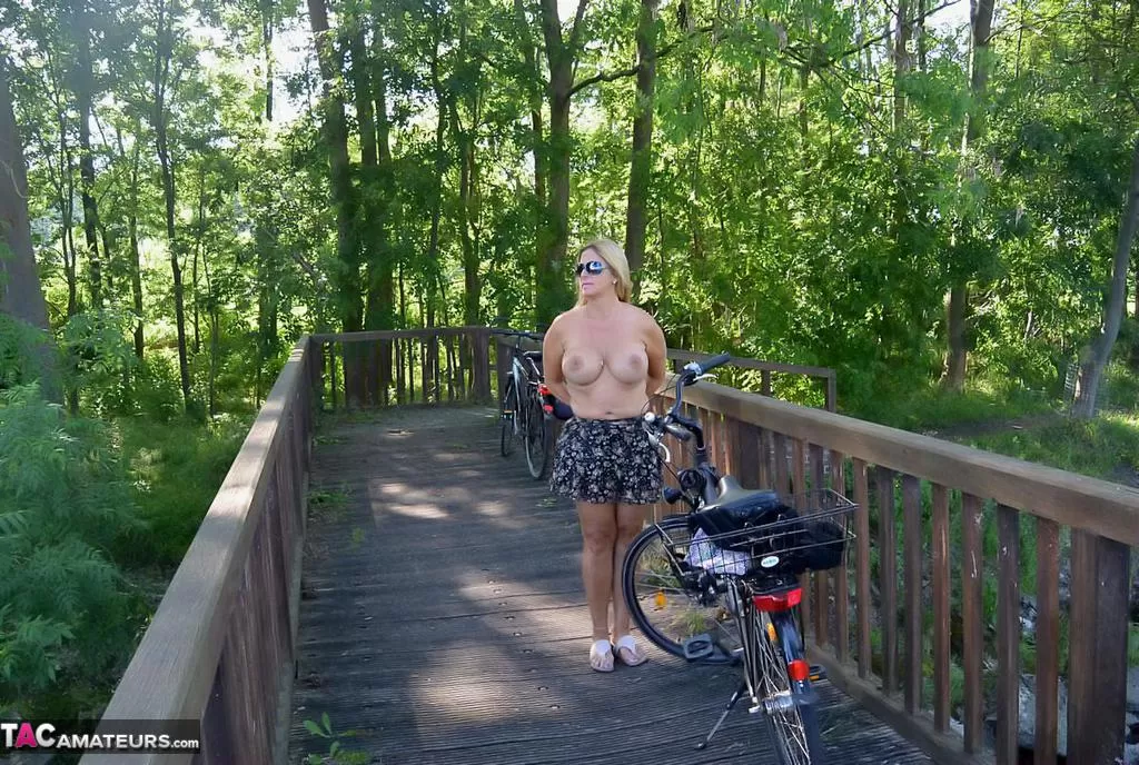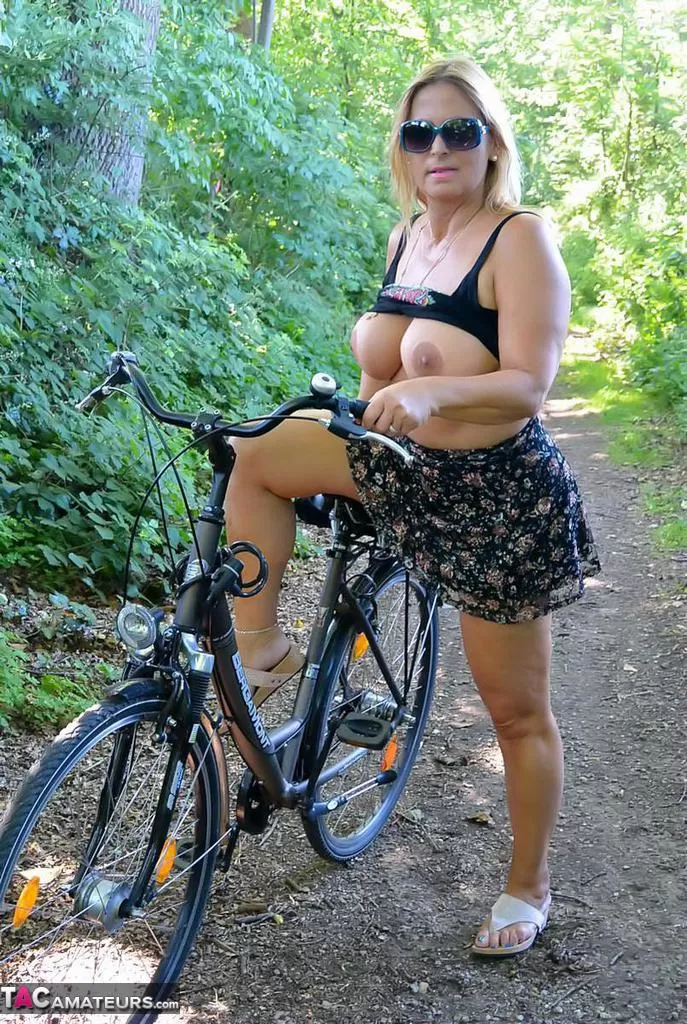 Грудастая пухленькая зрелая Крисси катается на велосипеде топлесс, покачивая своими огромными сиськами