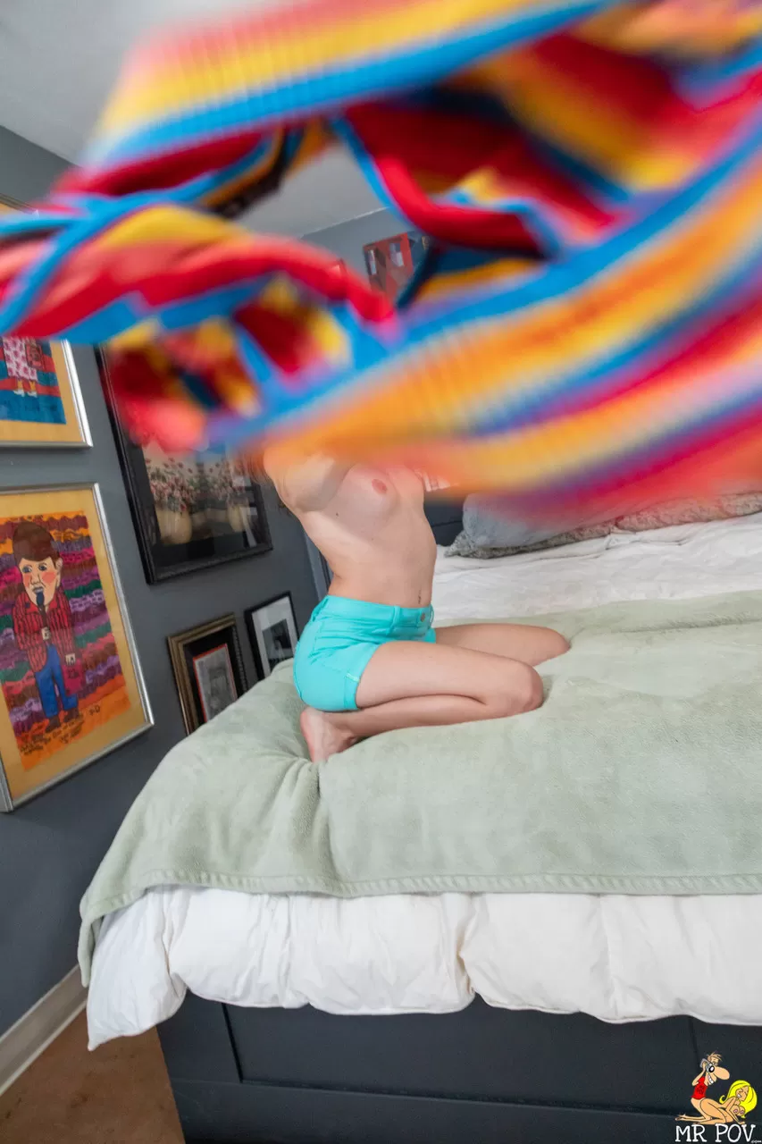 Худенькая девушка сплевывает сперму себе на руку после секса от первого лица на кровати