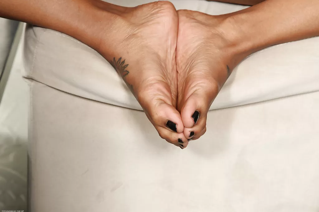 Худенькая негритянка с татуировкой на животе демонстрирует свою выбритую расщелину