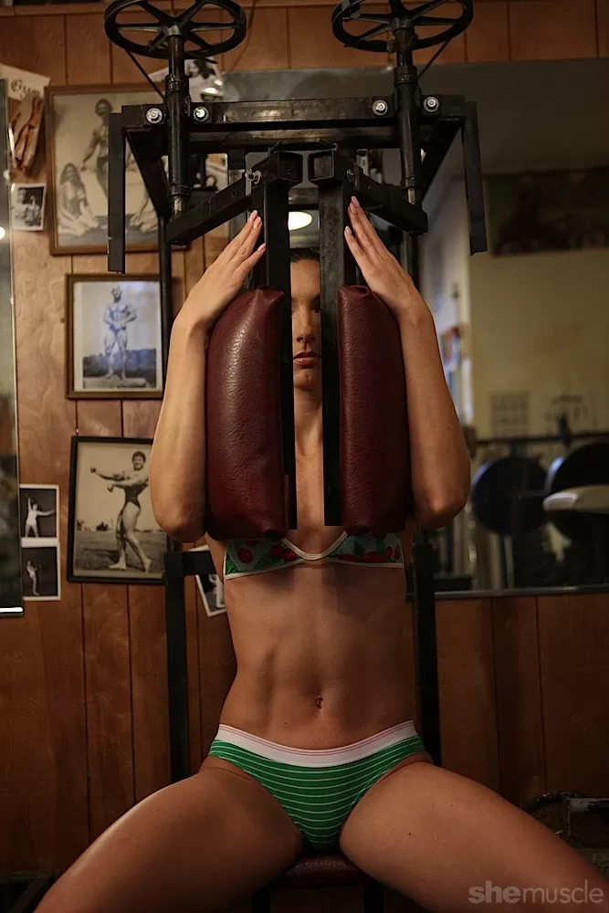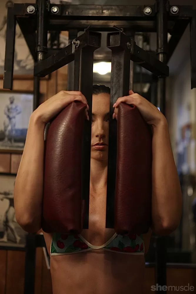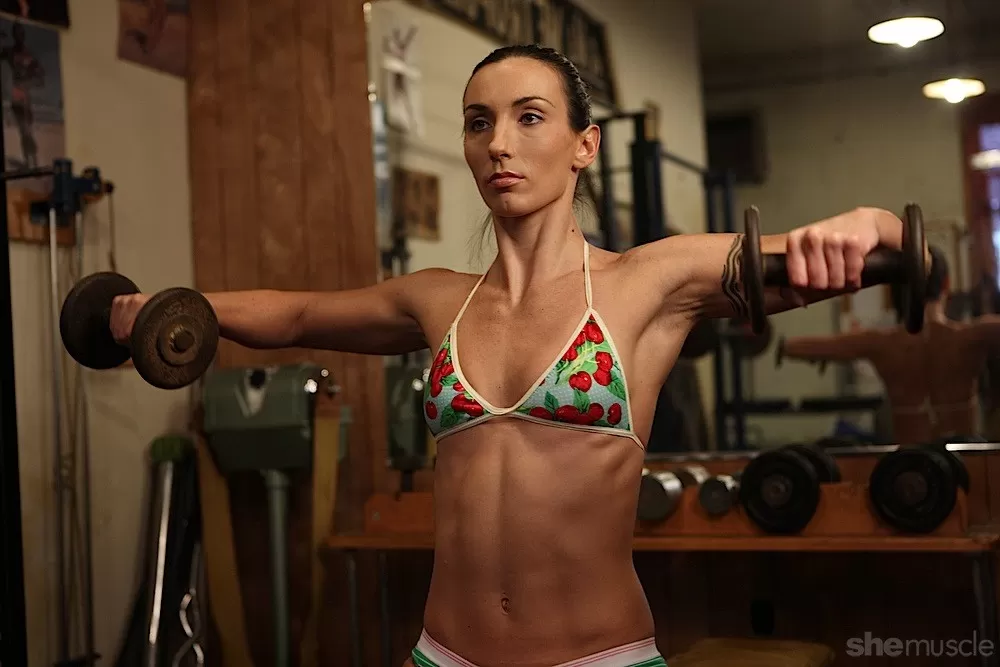 Женщина-бодибилдер демонстрирует нулевую жировую прослойку во время тренировки в обнаженном виде