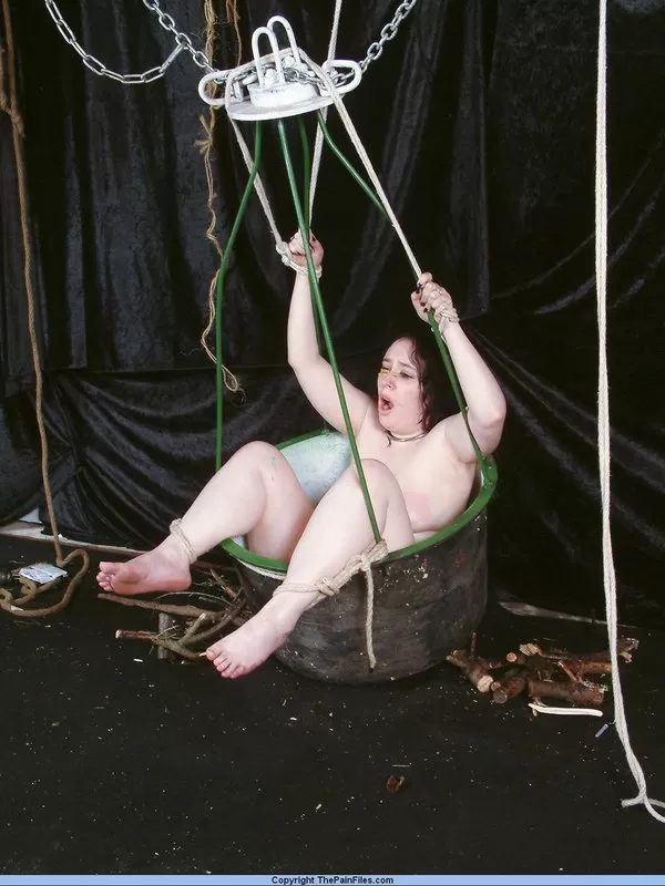 Женщину-секс-рабыню с избыточным весом удерживают в корзине во время игры с иглой