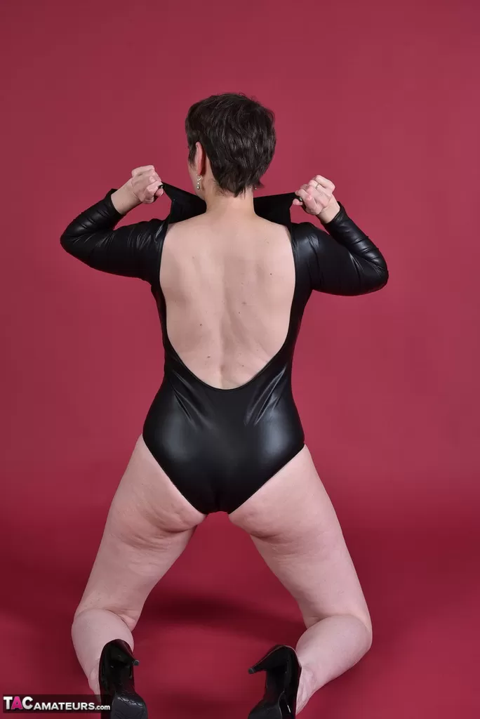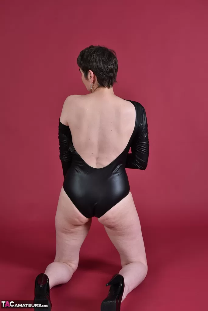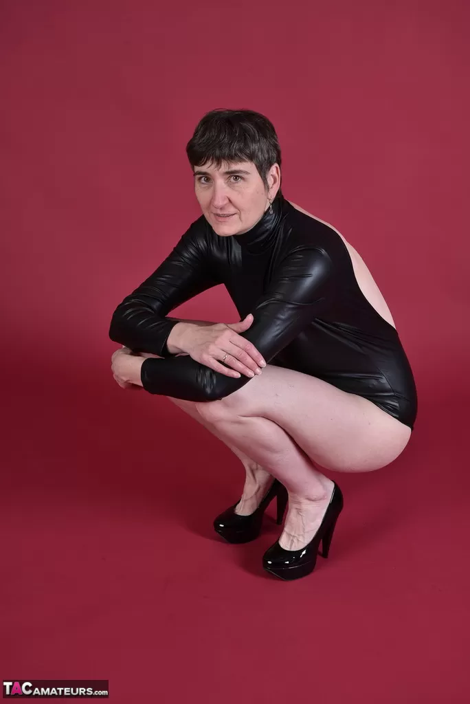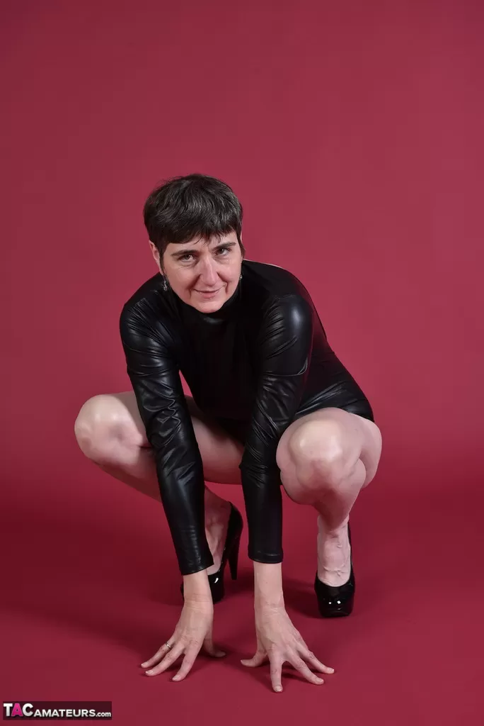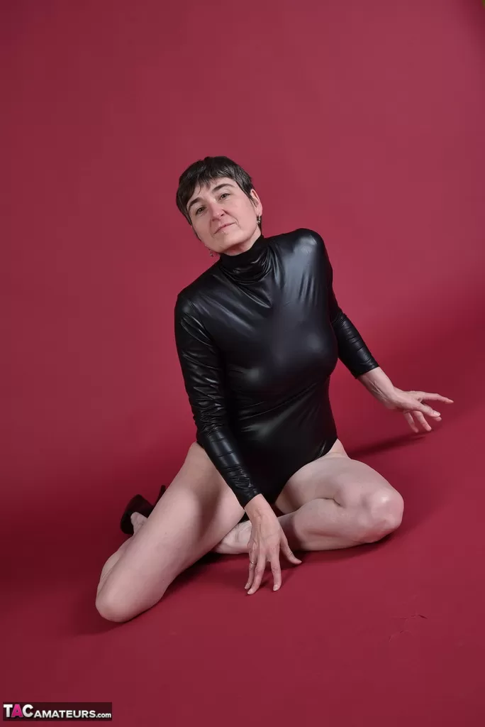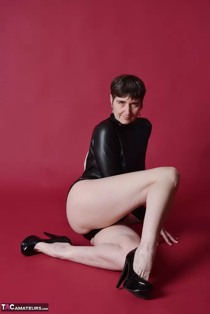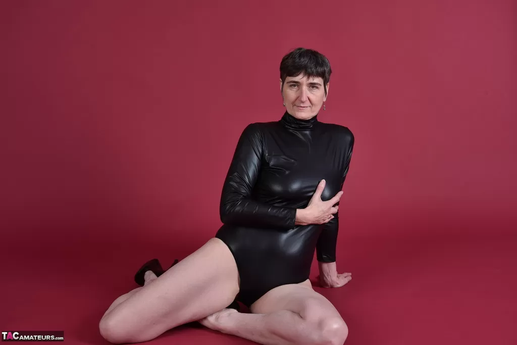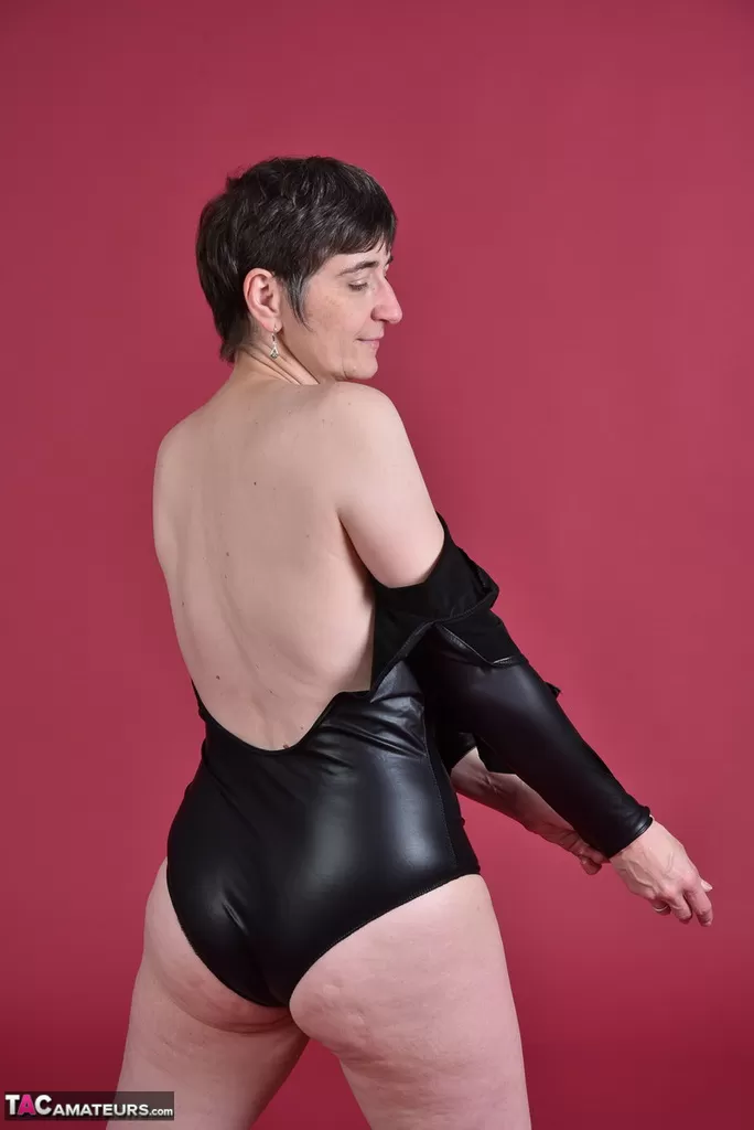 Коротко стриженная брюнетка постарше показывает свою лысую киску, моделируя полностью обнаженной