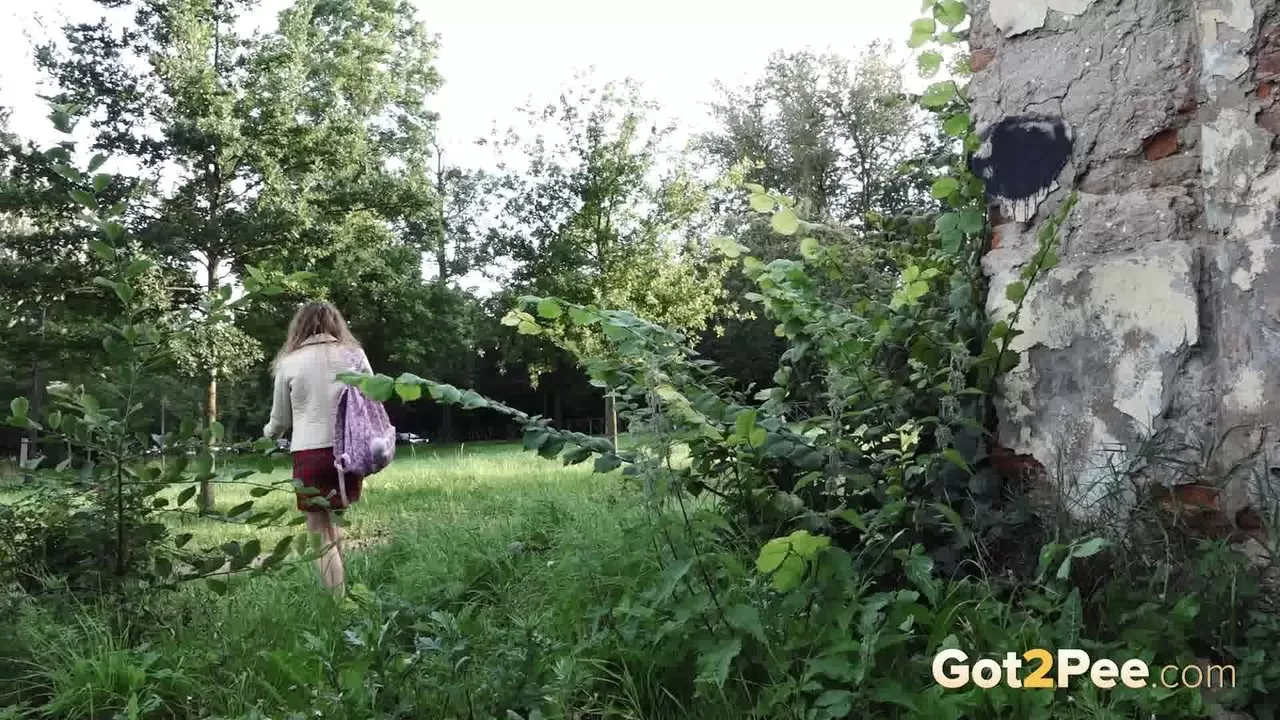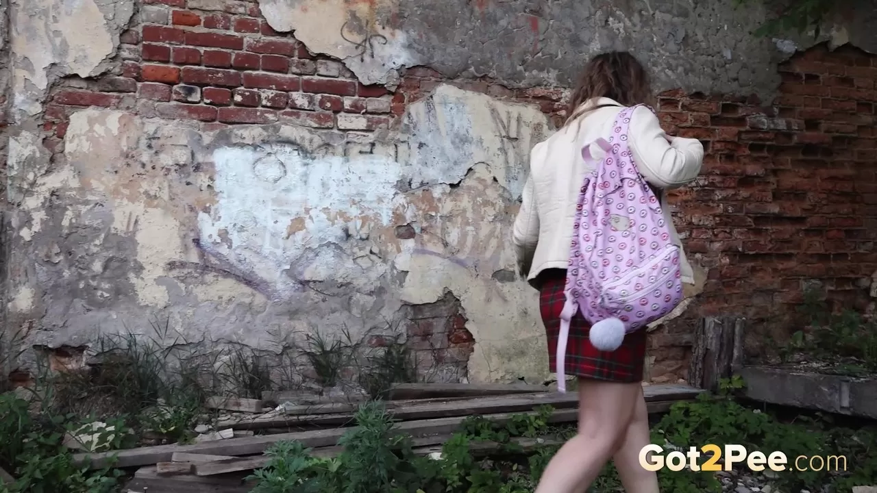 Коротко стриженная девушка Рита прячется за зданием, чтобы позарез помочиться