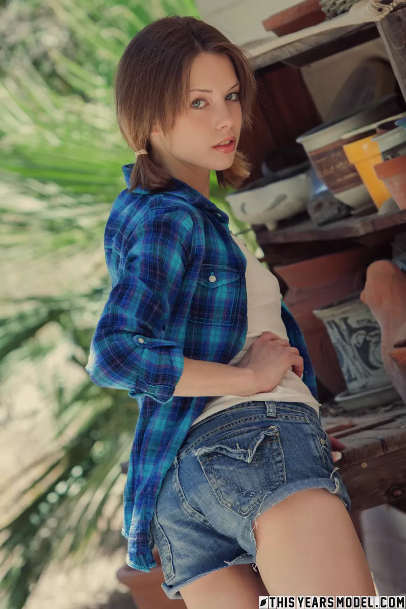 Красивая девушка Бонни обнажает свои крошечные сиськи, прежде чем показать свой подстриженный кустик