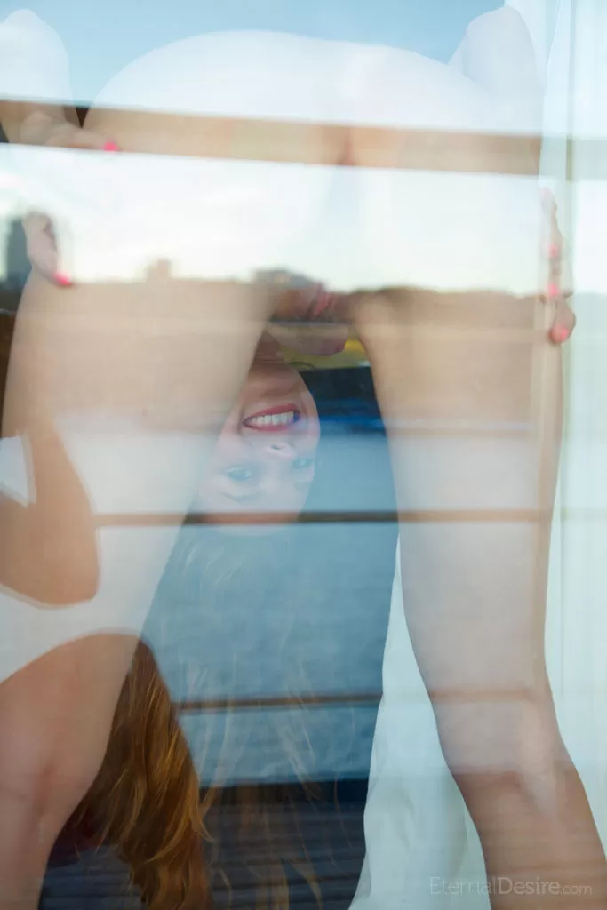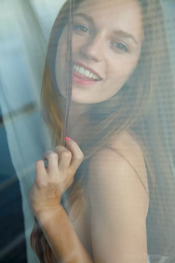 Красивая молоденькая Софи Шейн позирует обнаженной на столе за горячим напитком