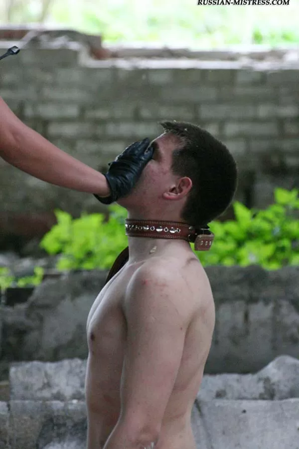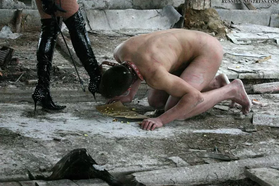 Латексная любовница кормит своего голого уродца где-то в руинах, выплевывая пережеванное яблоко