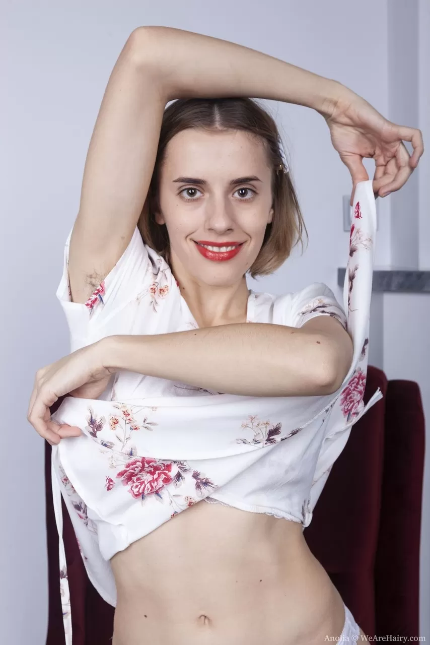 Любительская модель Анолия раздевается перед тем, как показать свою волосатую вагину