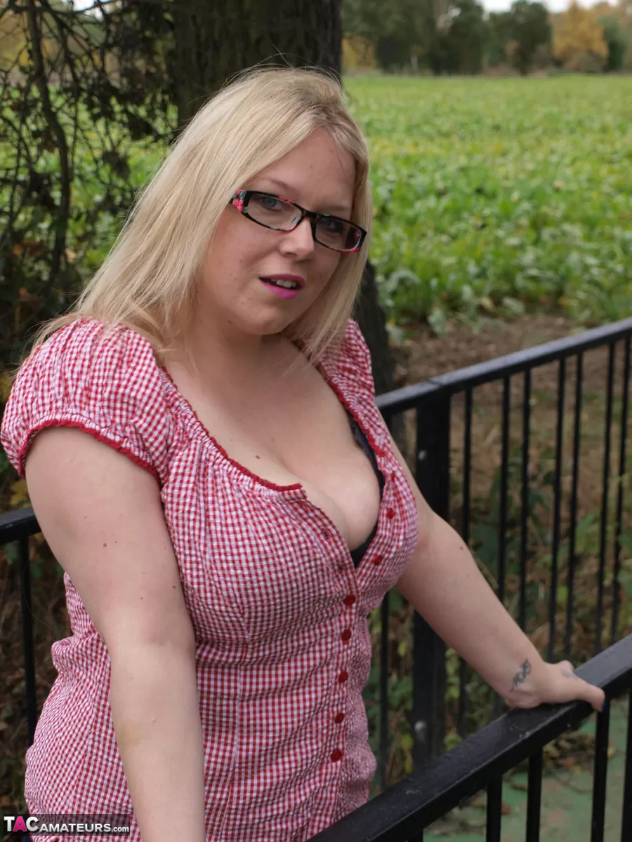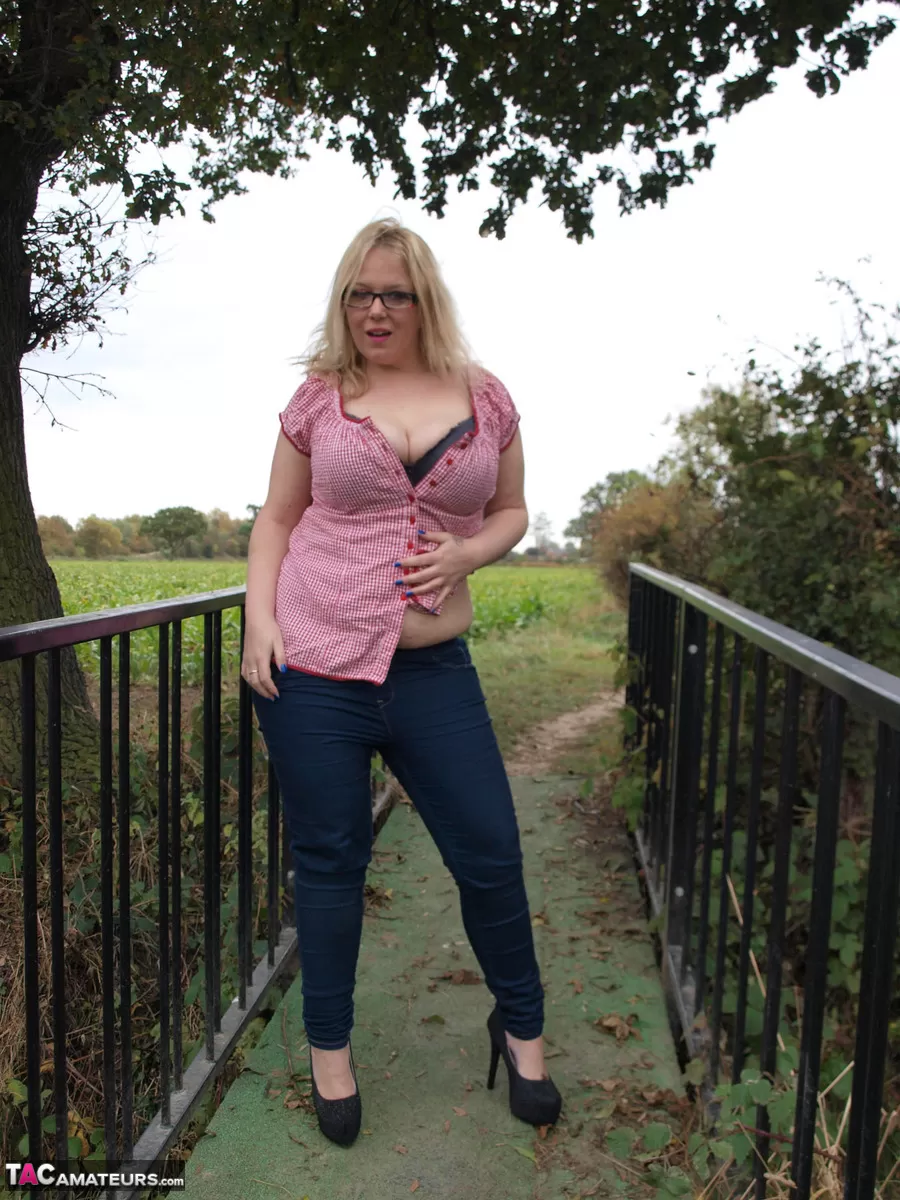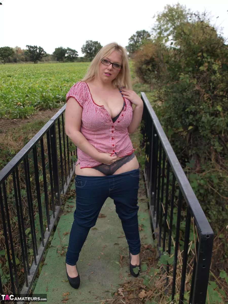 Любительская толстушки Синди Бюст обнажает свои большие сиськи и пизду на загородном мосту
