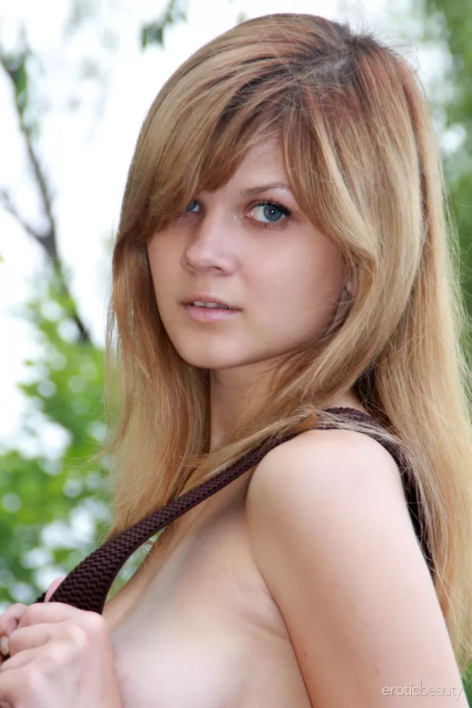 Милая девочка-подросток Агни А снимает подтяжки и джинсовые шорты для позирования обнаженной