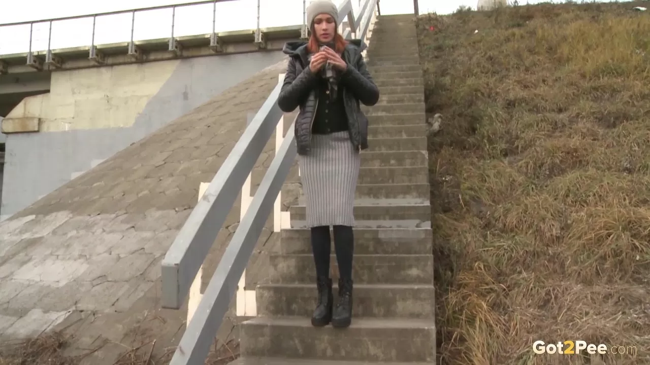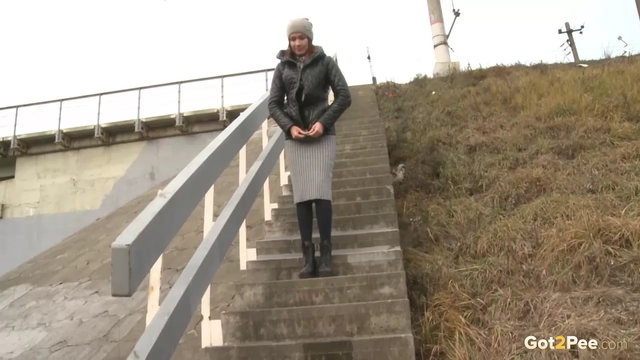 Милая девушка Кристель задирает юбку, чтобы пописать на лестничный пролет на открытом воздухе