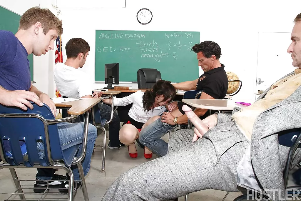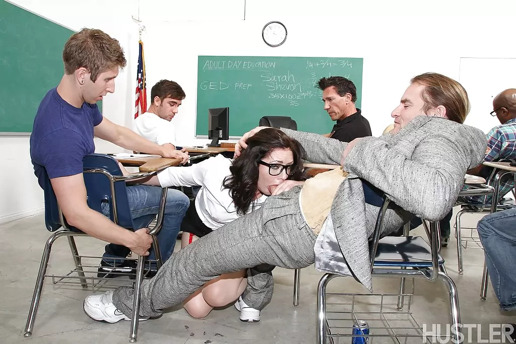 Милф-порнозвезда Сара Шевон получает групповуху в сцене с учителем и ученицей