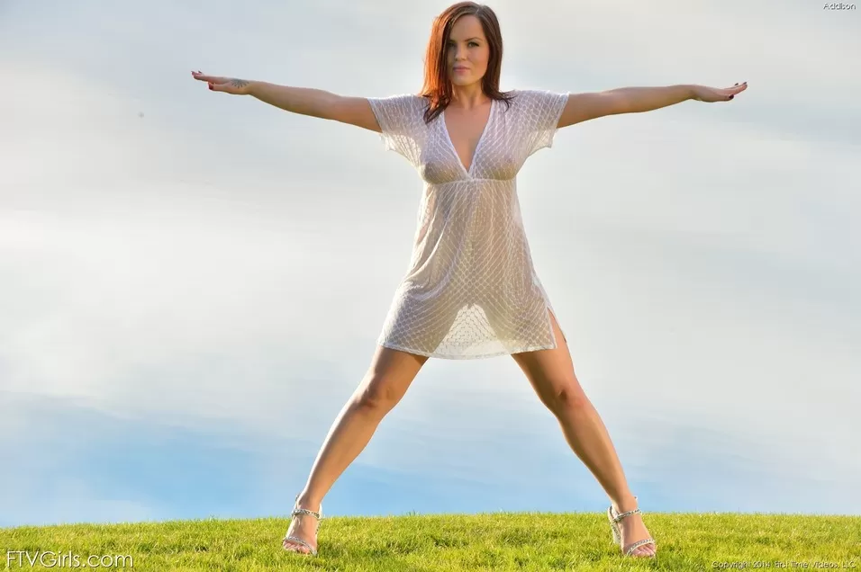 Миниатюрная обнаженная модель снимает прозрачную одежду в общественном парке