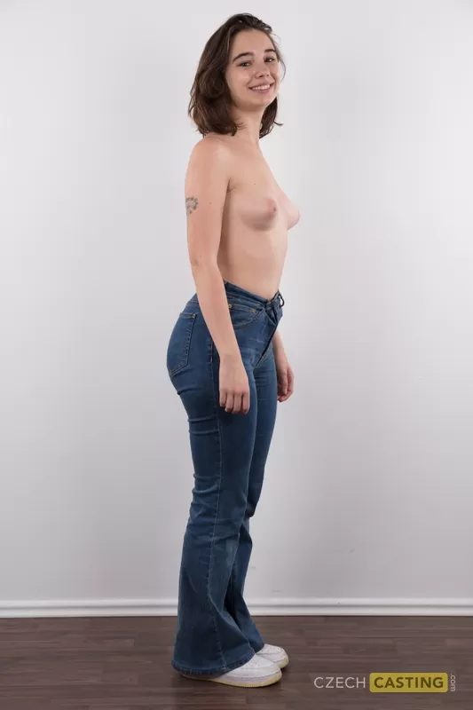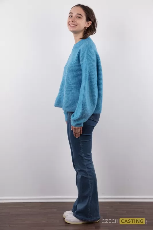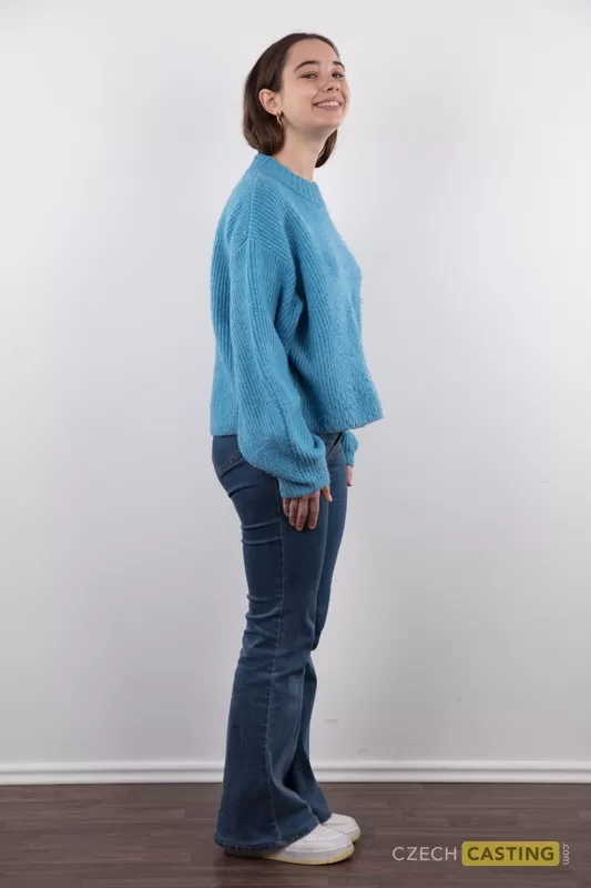 Модель-любитель Ульяна стоит обнаженная, сняв свитер и синие джинсы