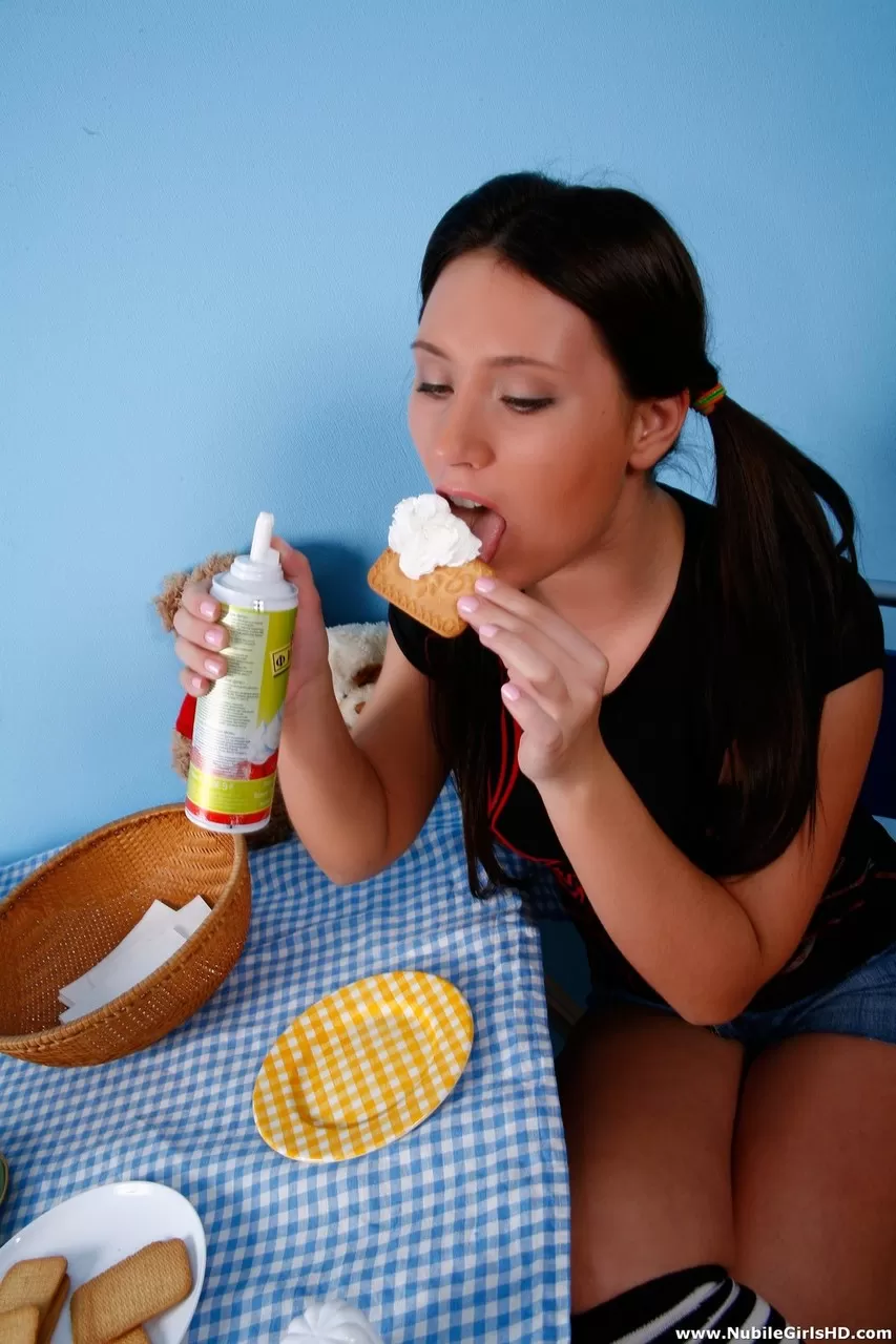 Молодая брюнетка Тесс обмазывается взбитыми сливками перед анальным сексом