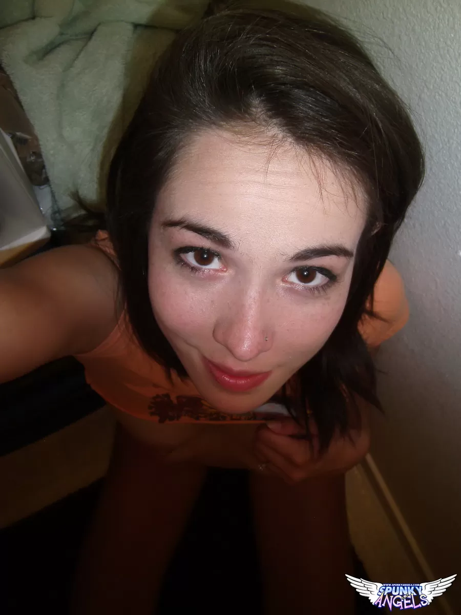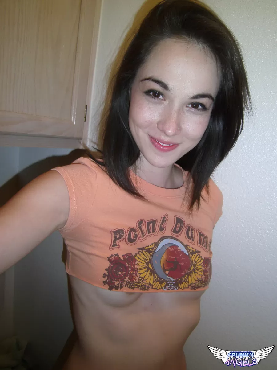 Молодая девушка-любительница делает селфи, обнажая свои маленькие сиськи и киску