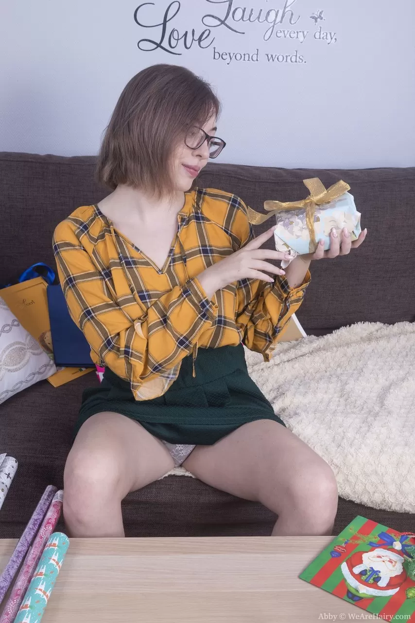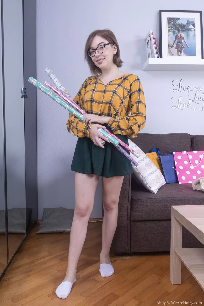 Молоденькая любительница Эбби показывает свои волосатые ягодицы и кустик в очках