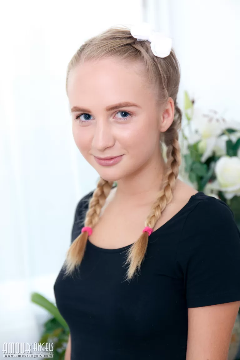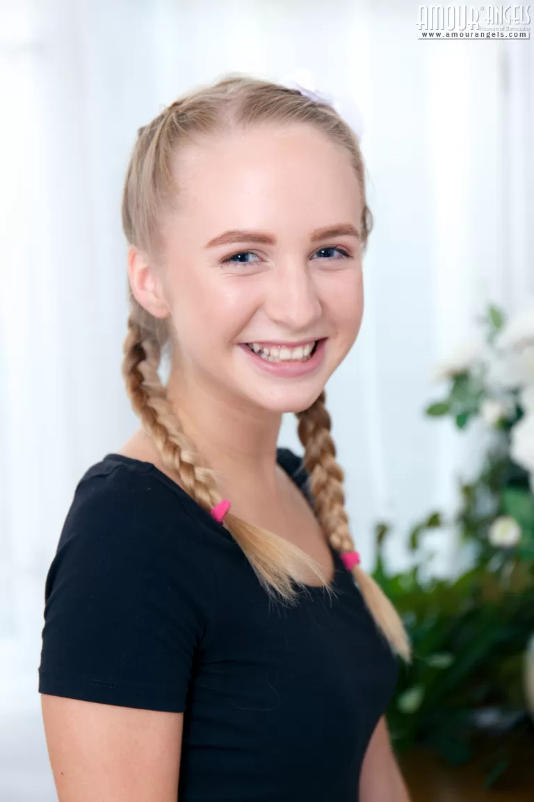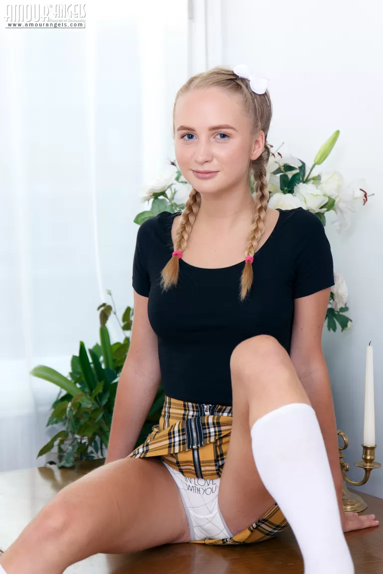 Молодо выглядящая девушка обнажает свое загорелое тело в белых школьных носках