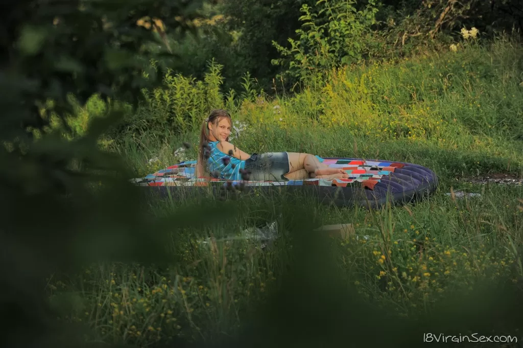 Молодо выглядящая девушка Оксана теряет свою девственность с двумя парнями в поле
