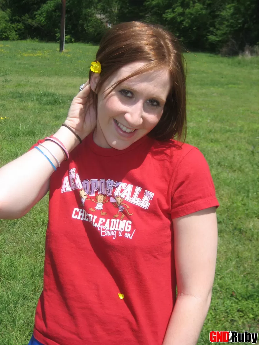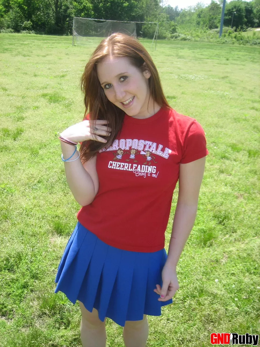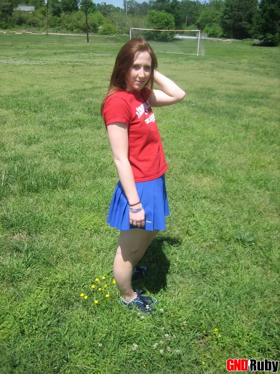 Молодо выглядящая рыжеволосая красотка демонстрирует свои сиськи и нижнее белье на футбольном поле