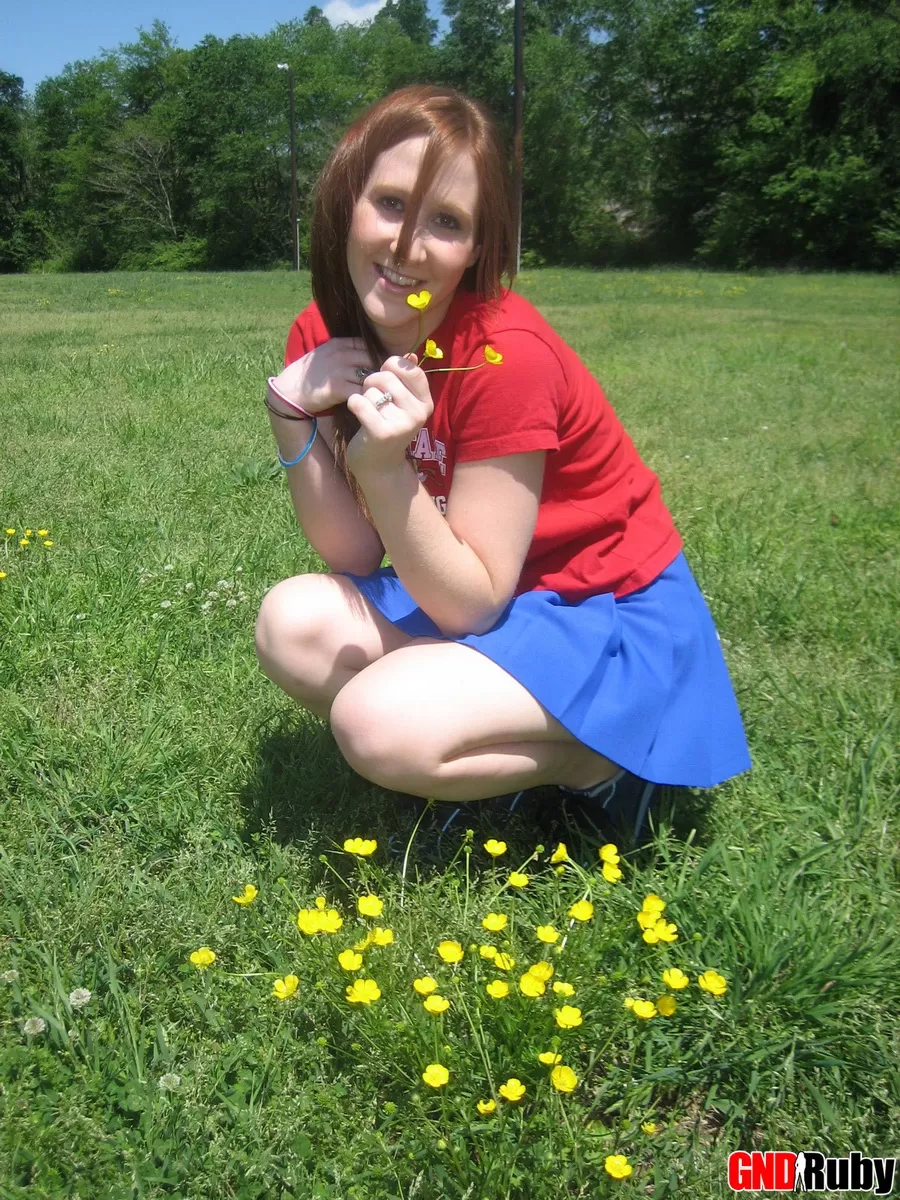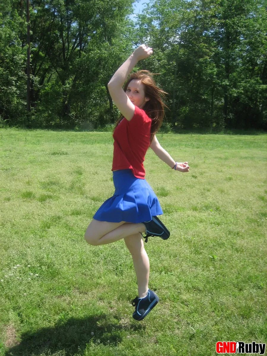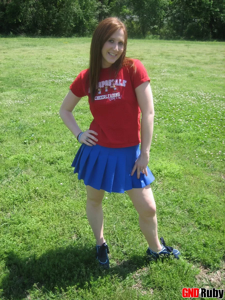 Молодо выглядящая рыжеволосая красотка демонстрирует свои сиськи и нижнее белье на футбольном поле