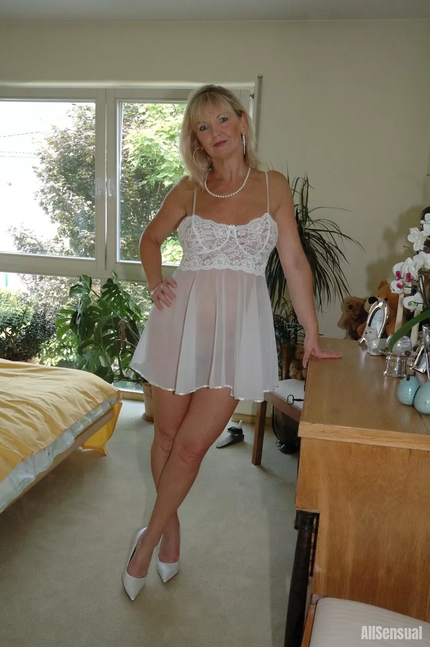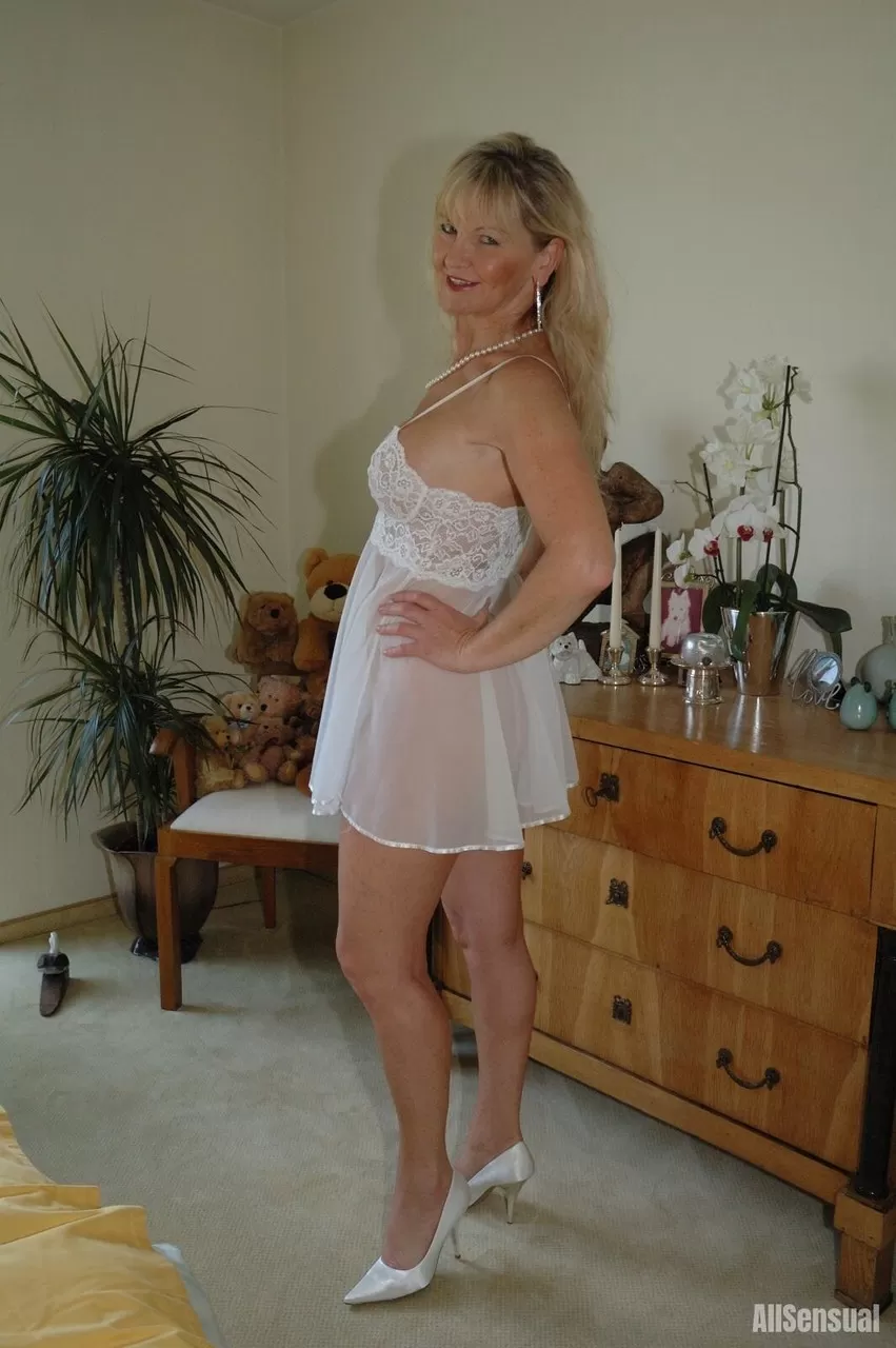 Натуральная блондинка Марлен обнажает свою грудь, находясь в своей спальне