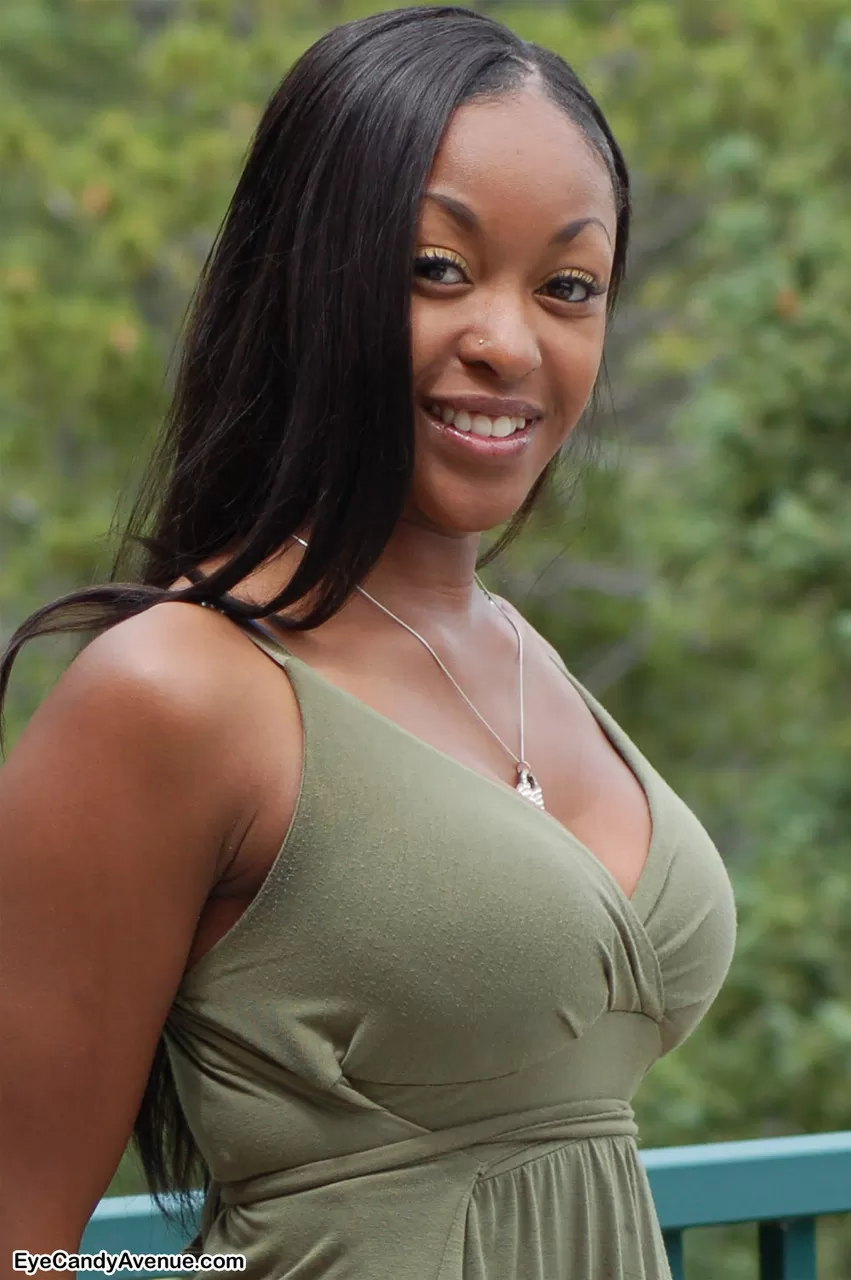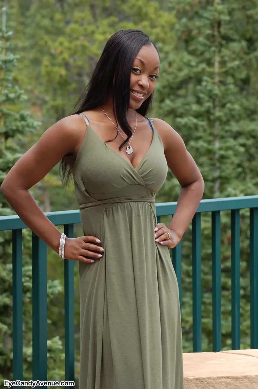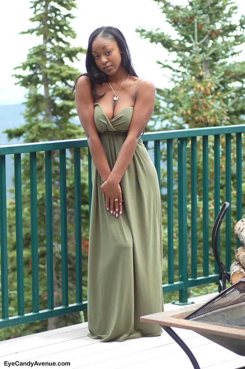 Негритянка-любительница Эмбер высвободила свои большие сиськи из длинного платья на балконе