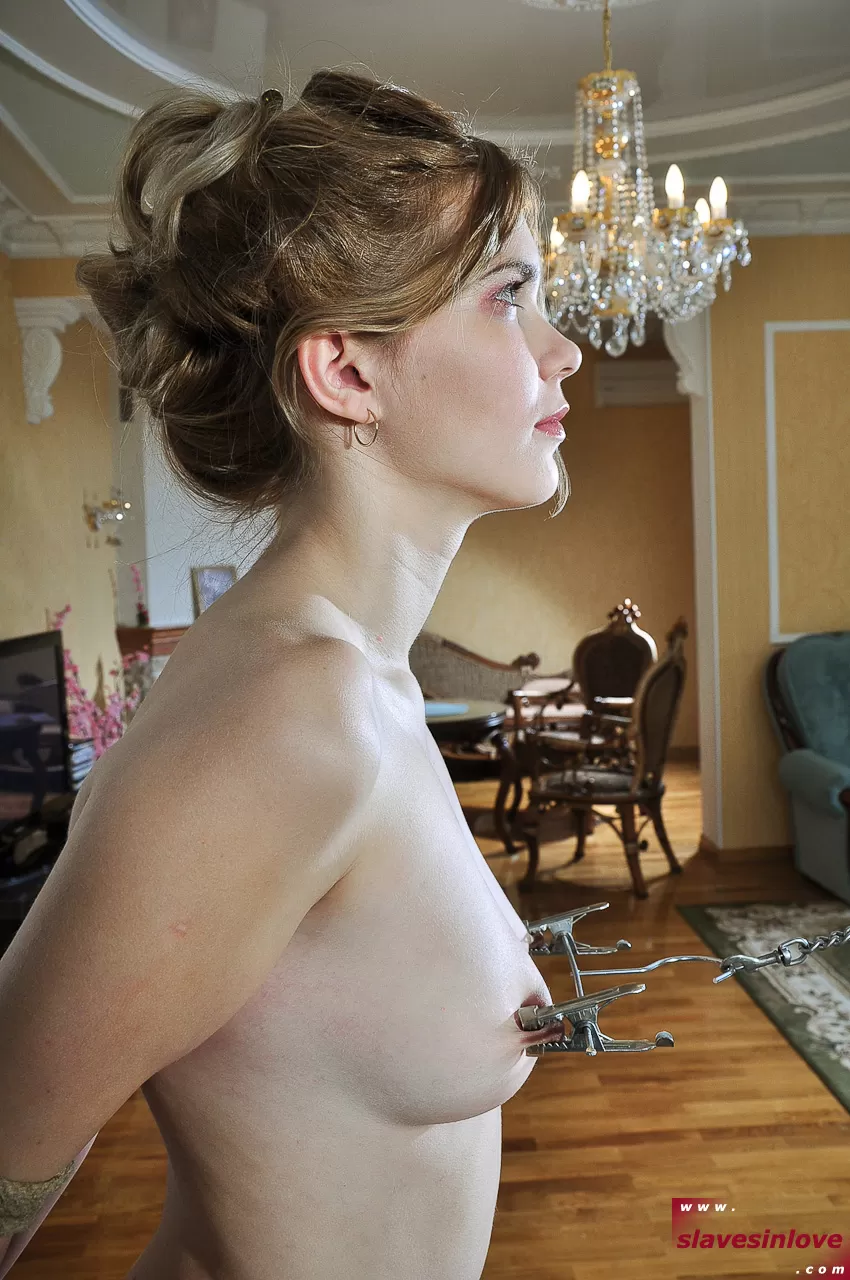 Обнаженная рабыня снабжена зажимами для сосков и расширителем для рта во время порки