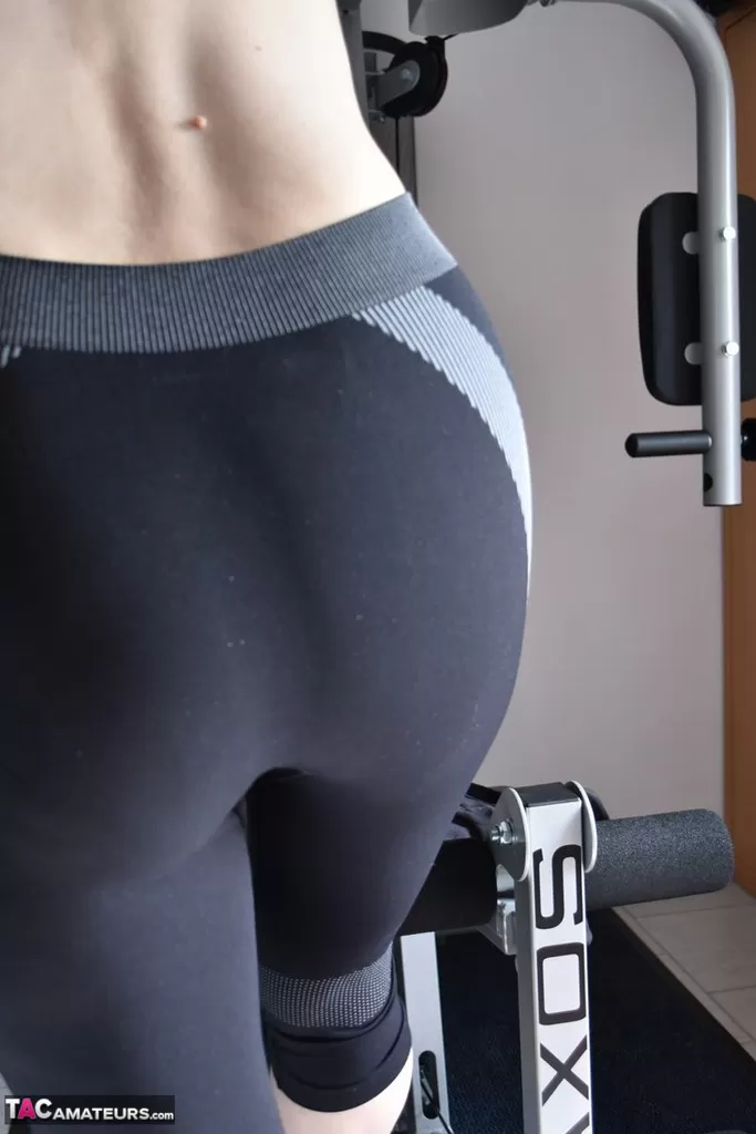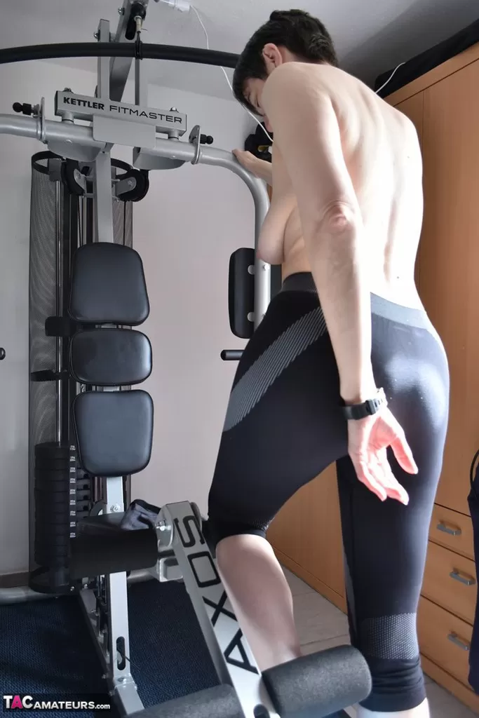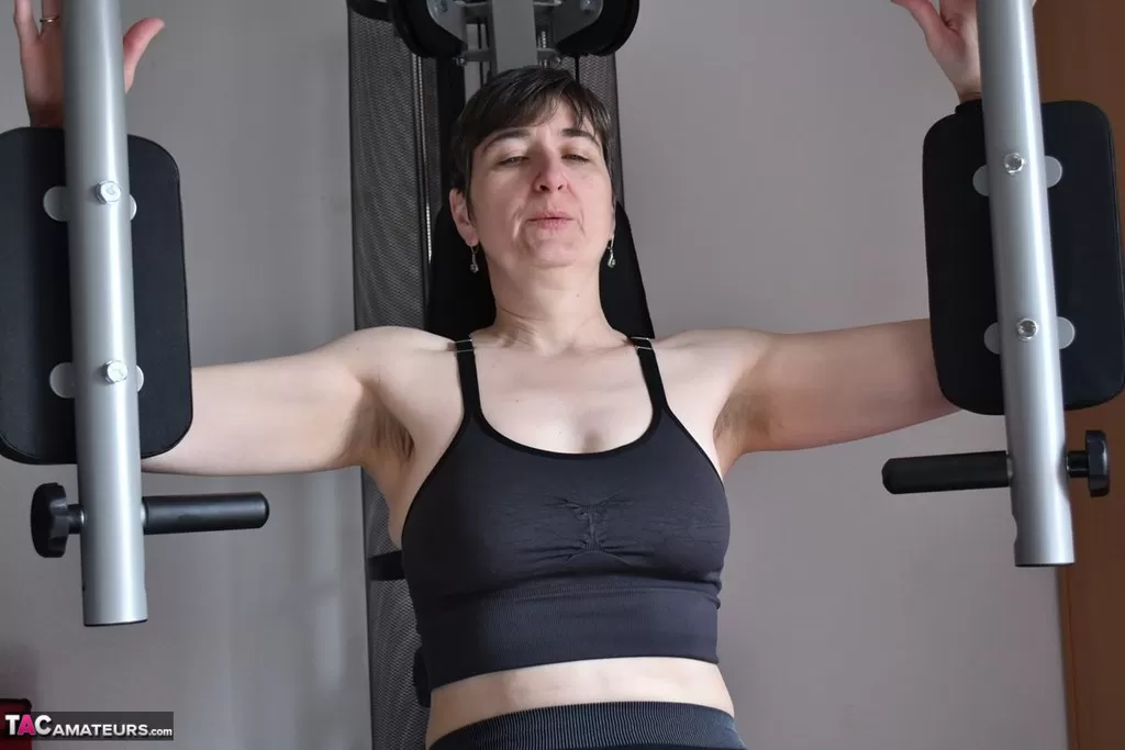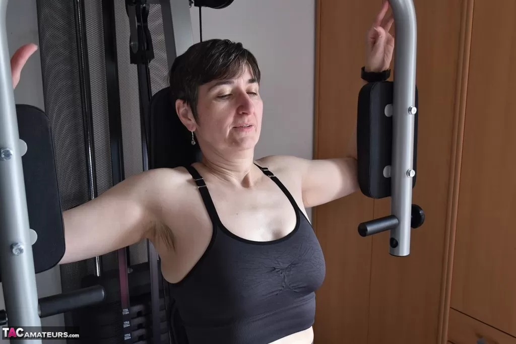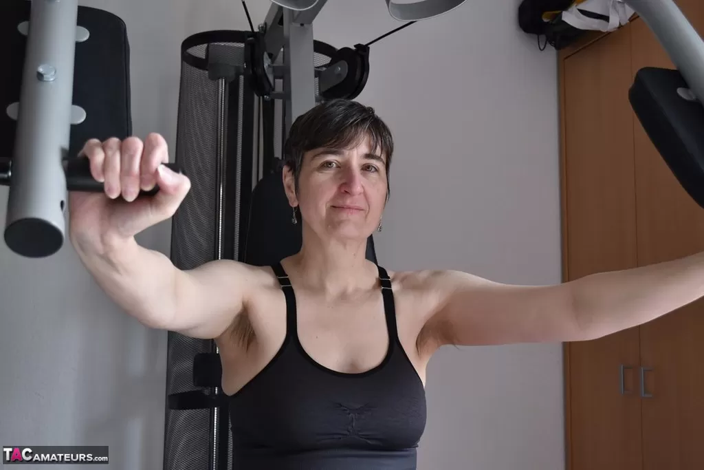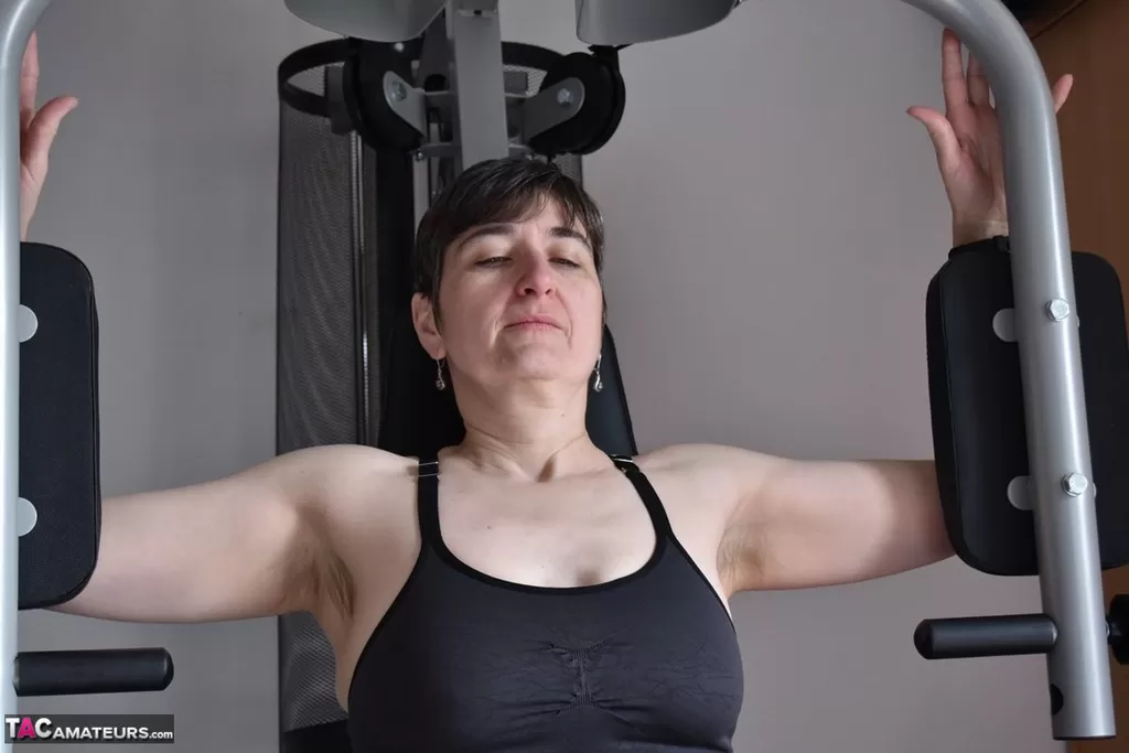 Подтянутая пожилая леди демонстрирует свои отвисшие сиськи во время тренировки в тренажерном зале
