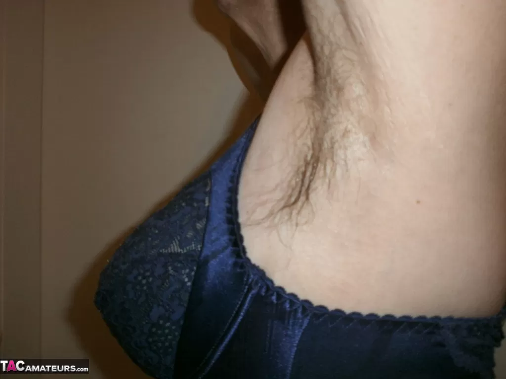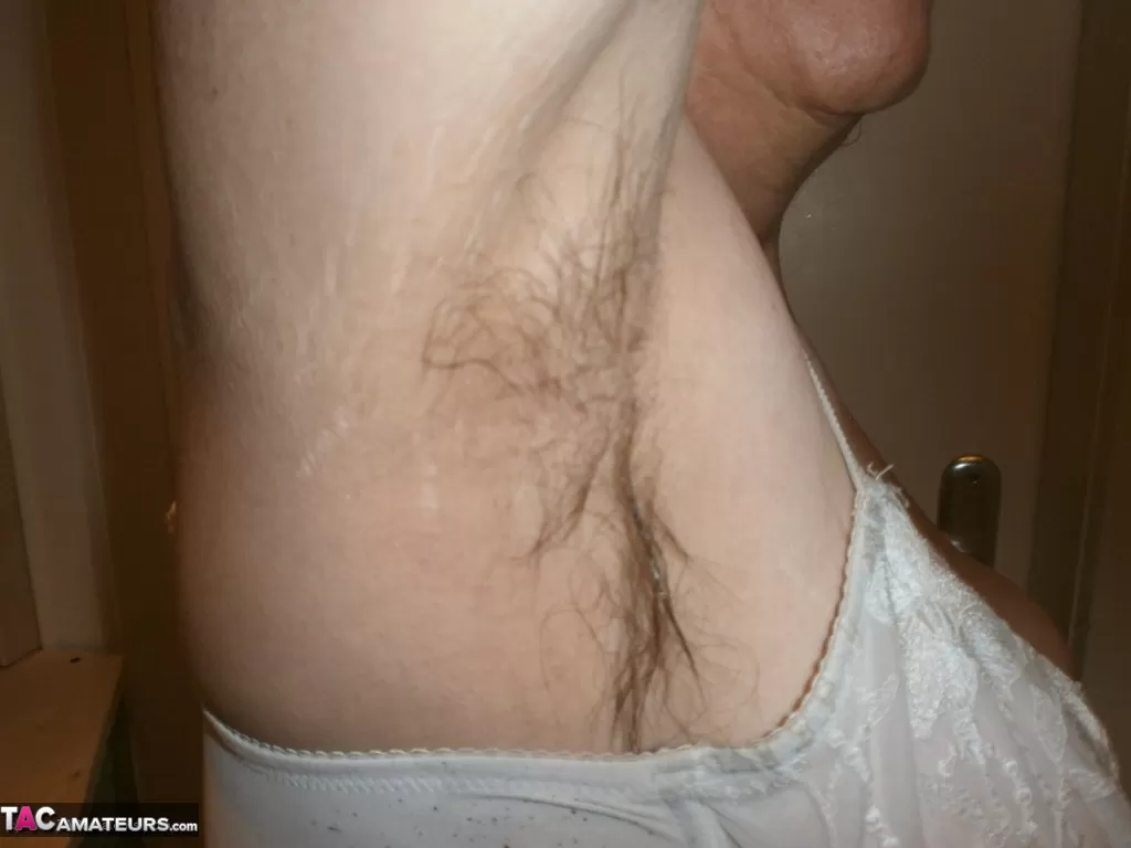 Пожилая дама с великолепными ногами показывает свои покрытые потными волосами подмышки