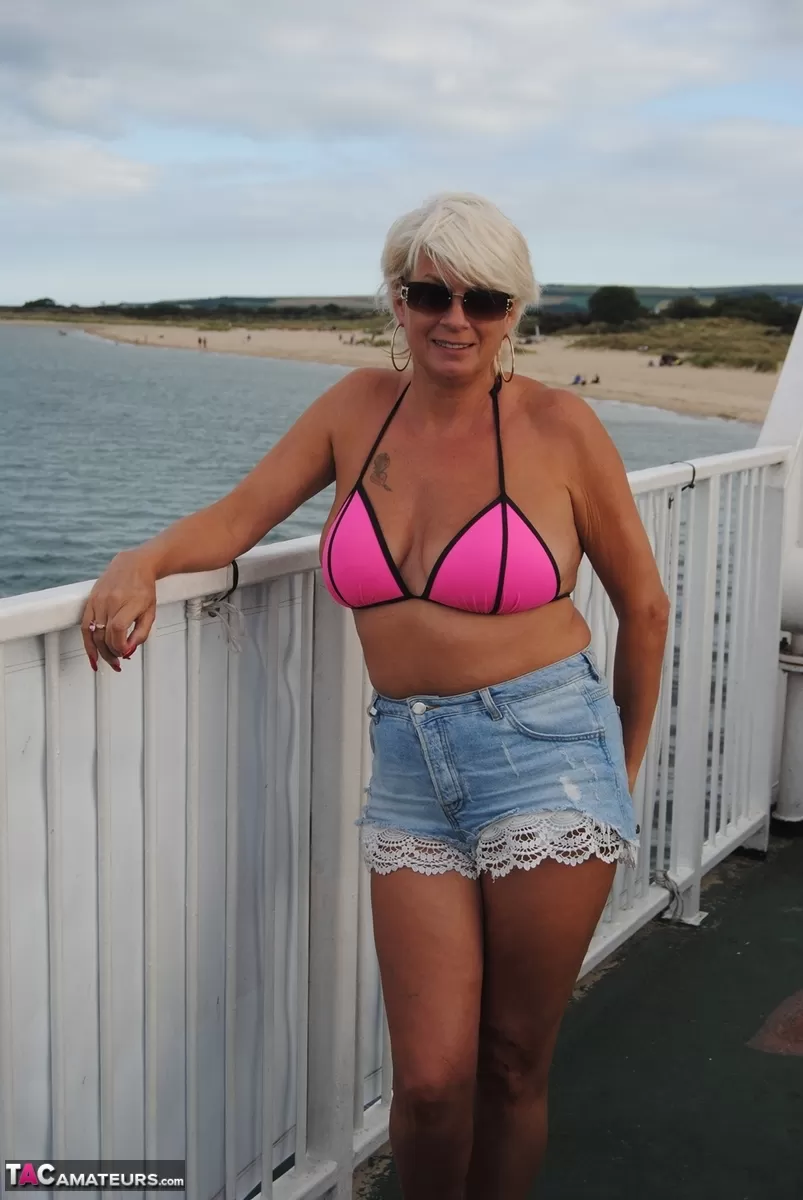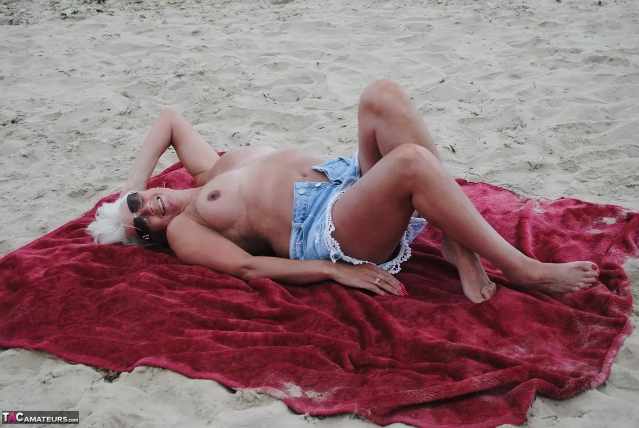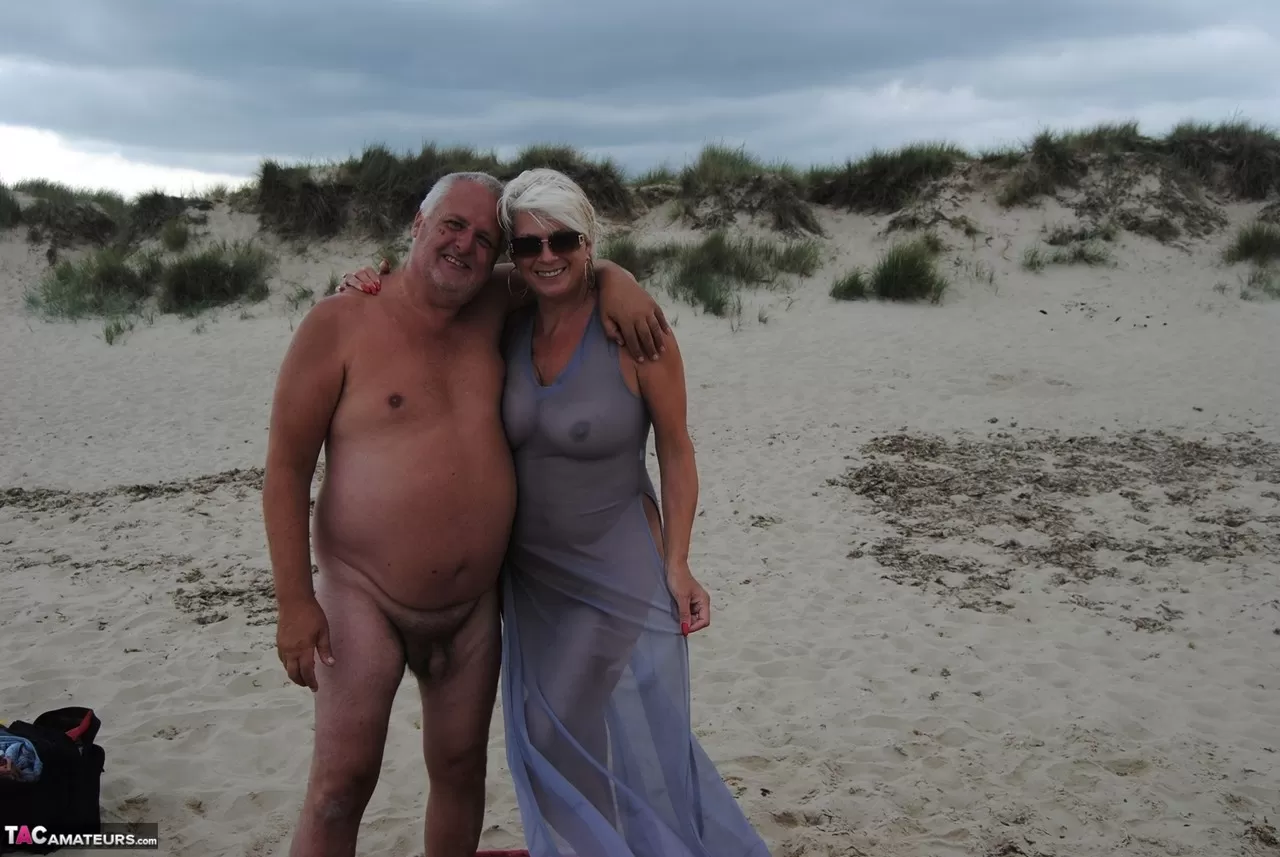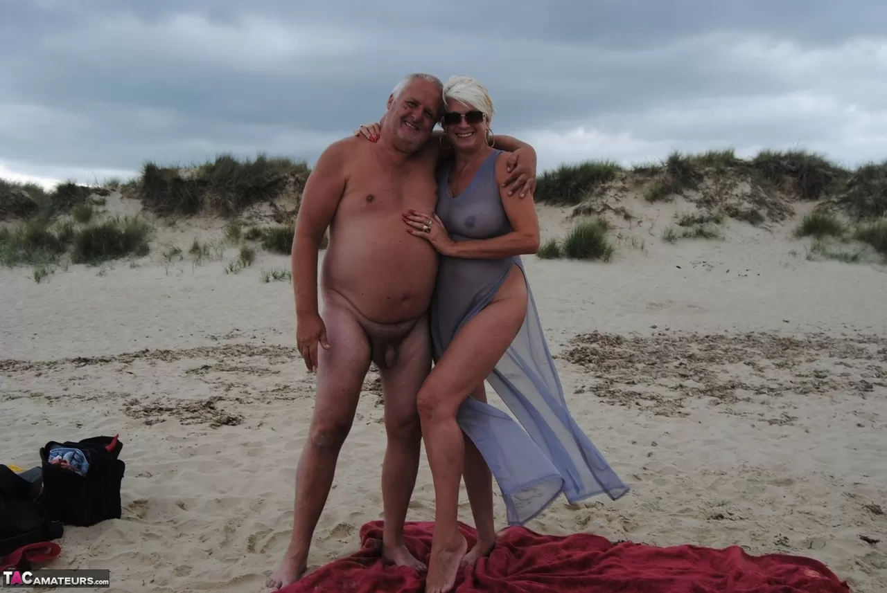 Пожилая платиновая блондинка Димонти посылает воздушный поцелуй на нудистском пляже со своим мужчиной