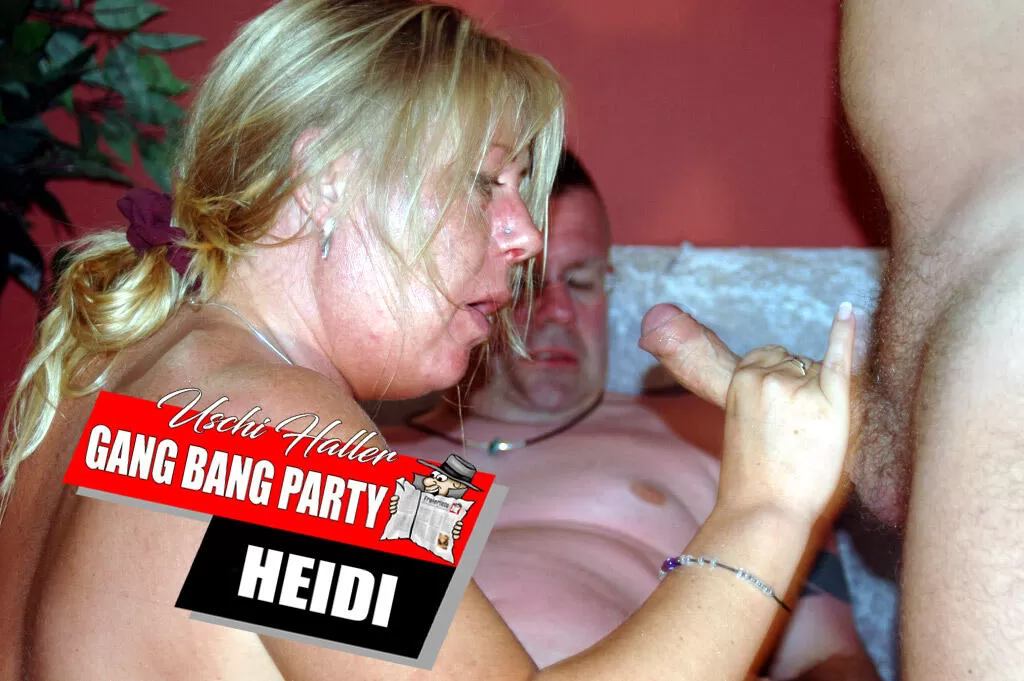 Пожилую блондинку Хайди трахают толпой во время любительского действа