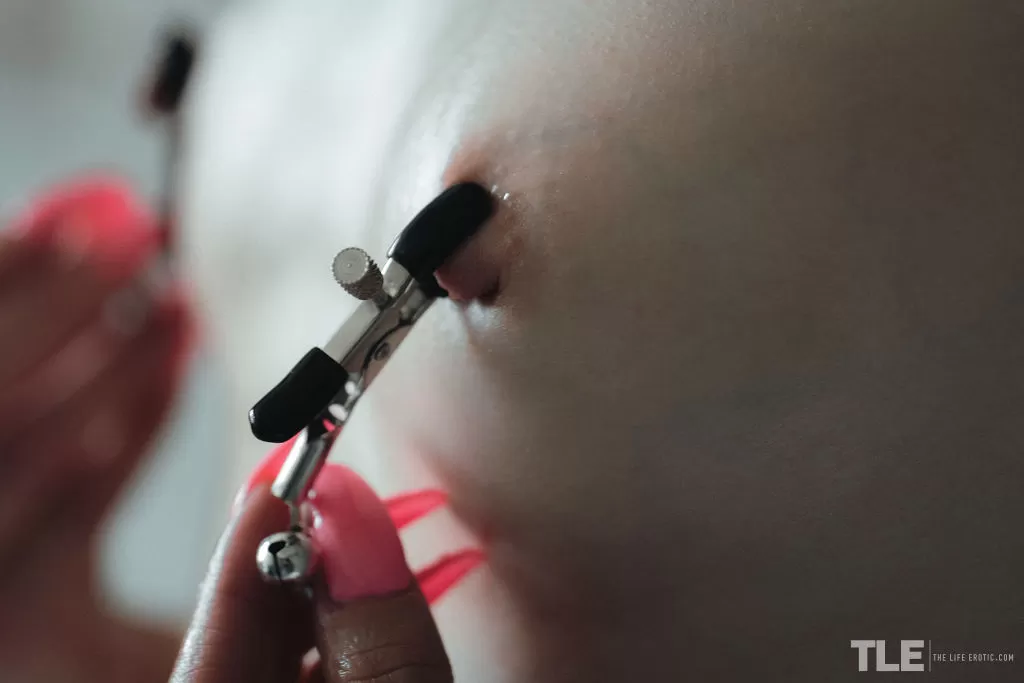 Потрясающая татуированная брюнетка Полли Стар стоит обнаженная в своей ванне, облизывая губы