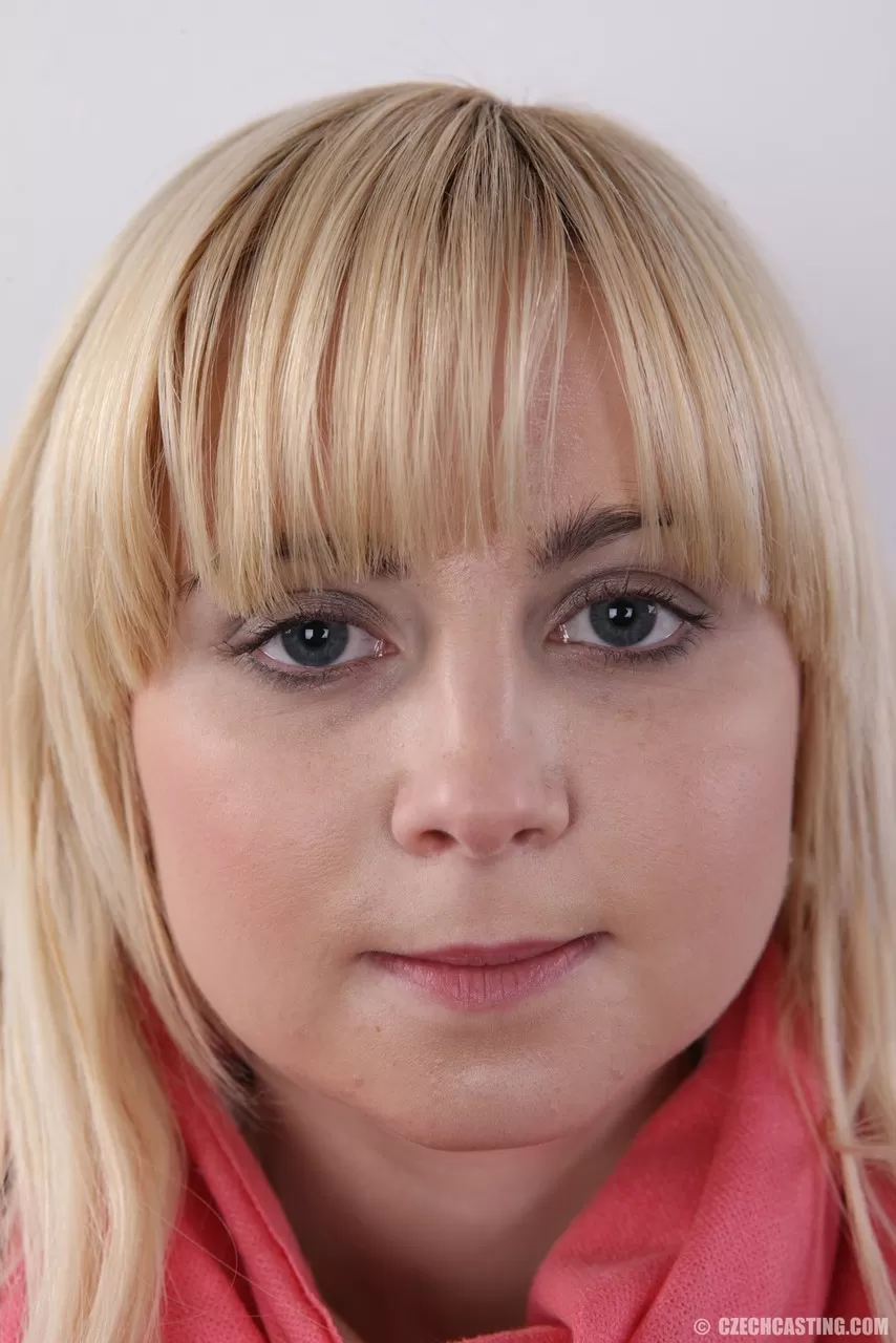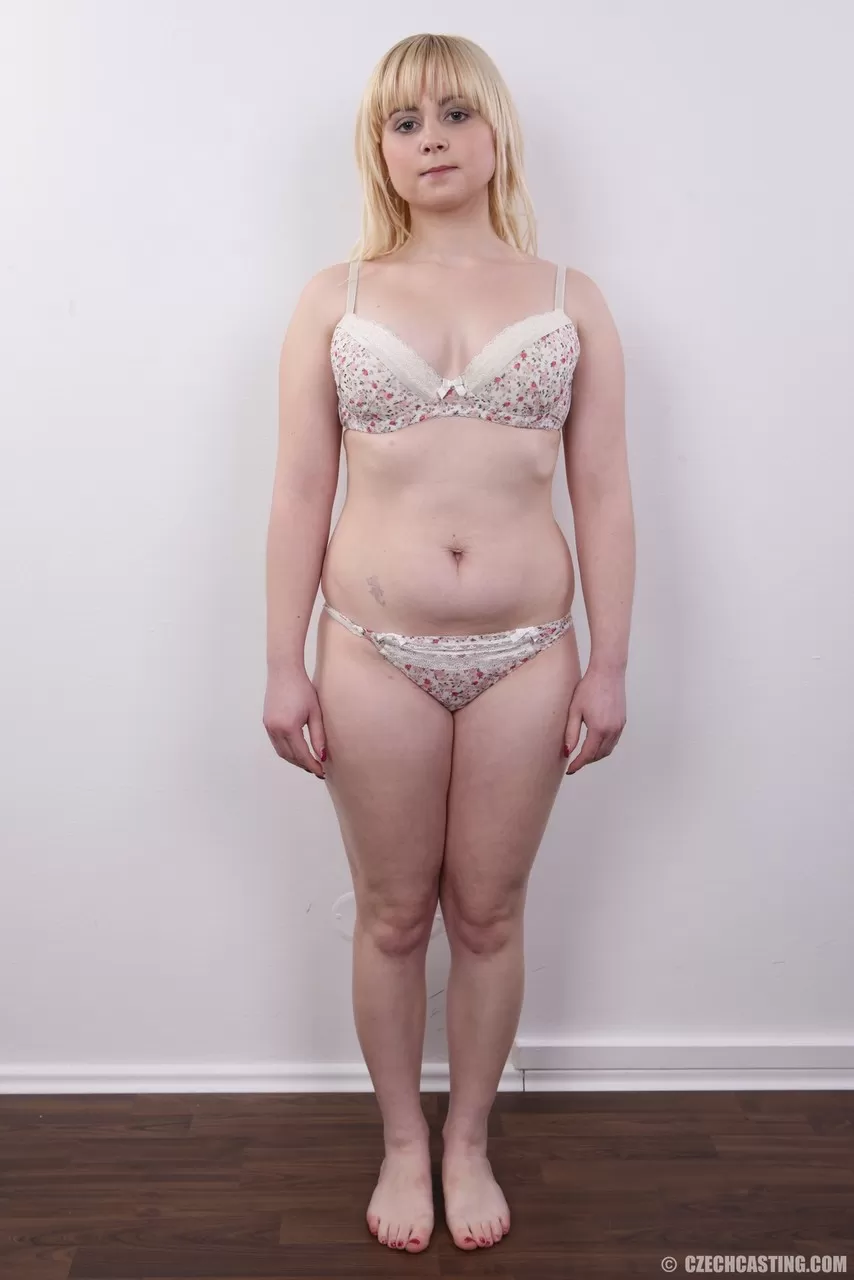 Пухленькая блондинка снимает с себя одежду, пока не оказывается голой у стены
